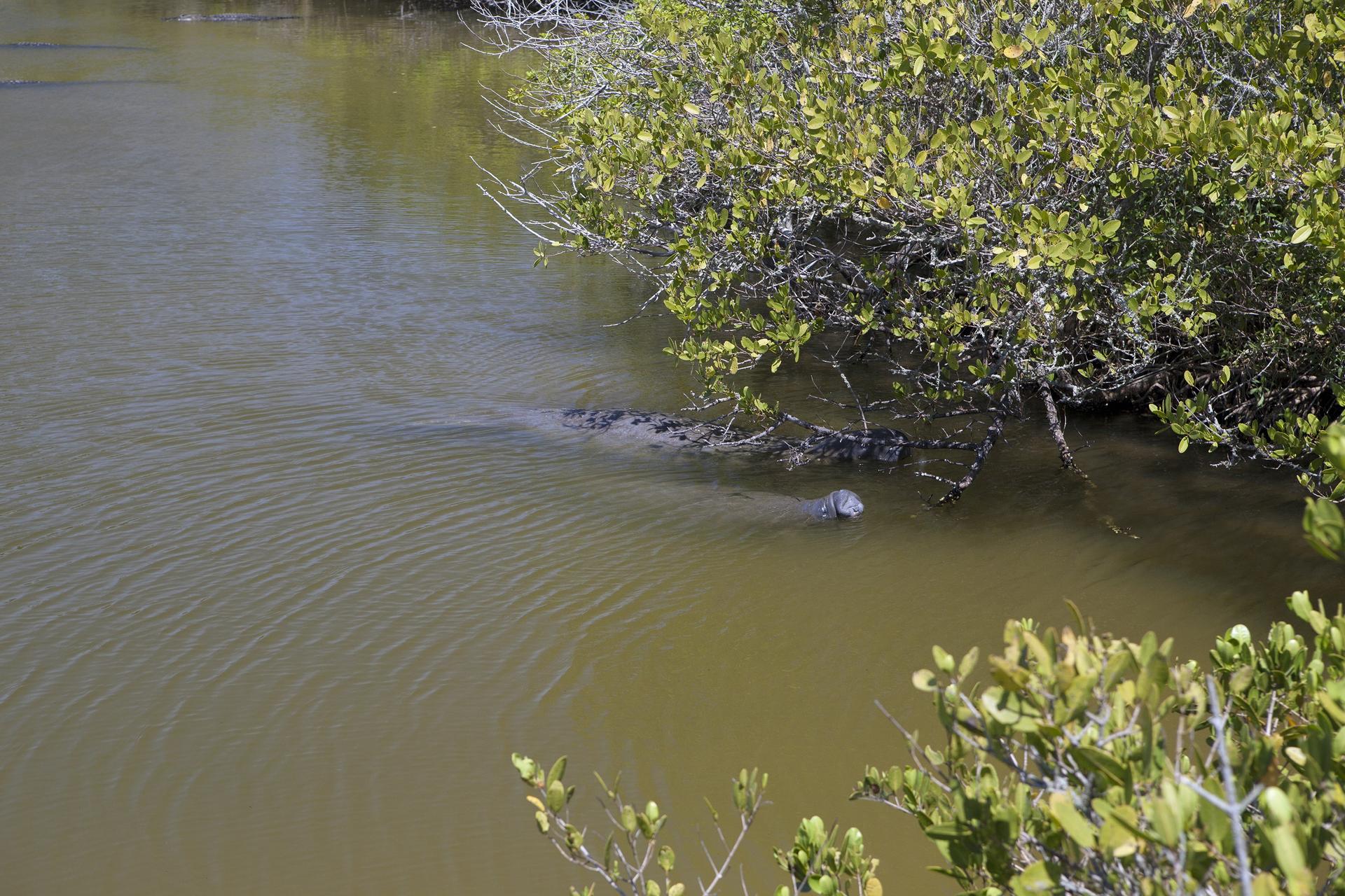 CAPE CANAVERAL, Fla. – A parent and a baby manatee come up for air beneath the branches of a mangrove in a creek at NASA's Kennedy Space Center in Florida. The center shares a boundary with the Merritt Island National Wildlife Refuge, which encompasses 140,000 acres that provide a habitat for more than 330 species of birds, 31 mammals, 117 fishes, and 65 amphibians and reptiles. Photo credit: NASA/Daniel Casper