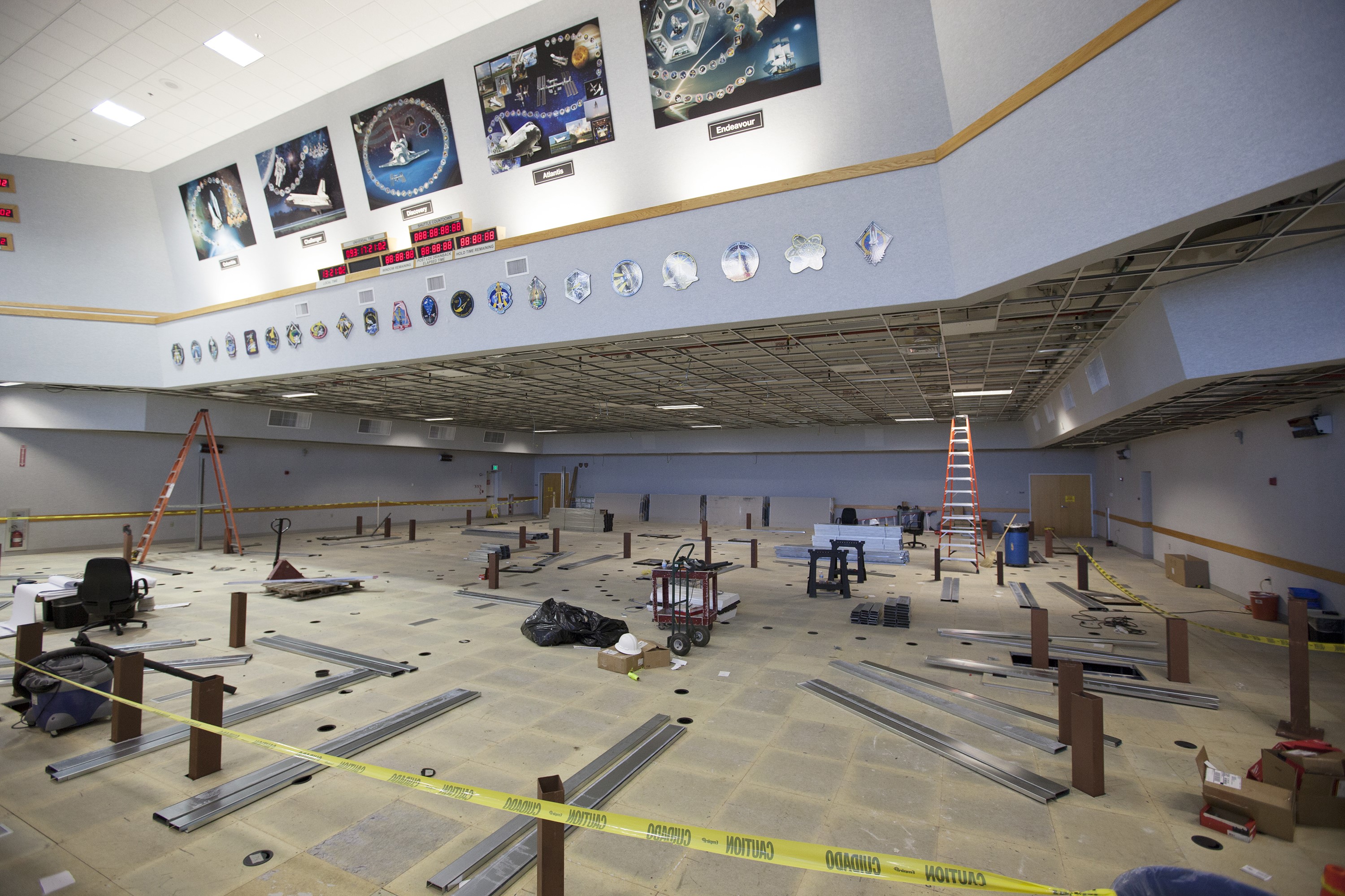 CAPE CANAVERAL, Fla. – The Ground Systems Development and Operations Program is overseeing efforts to create a new multi-user firing room in Firing Room 4 in the Launch Control Center at NASA's Kennedy Space Center in Florida. The main floor consoles, cabling and wires below the floor and ceiling tiles above have been removed. Sub-flooring has been installed and the room is marked off to create four separate rooms on the main floor. In view along the soffit are space shuttle launch plaques for 21 missions launched from Firing Room 4. The design of Firing Room 4 will incorporate five control room areas that are flexible to meet current and future NASA and commercial user requirements. The equipment and most of the consoles from Firing Room 4 were moved to Firing Room 2 for possible future reuse. Photo credit: NASA/Ben Smegelsky