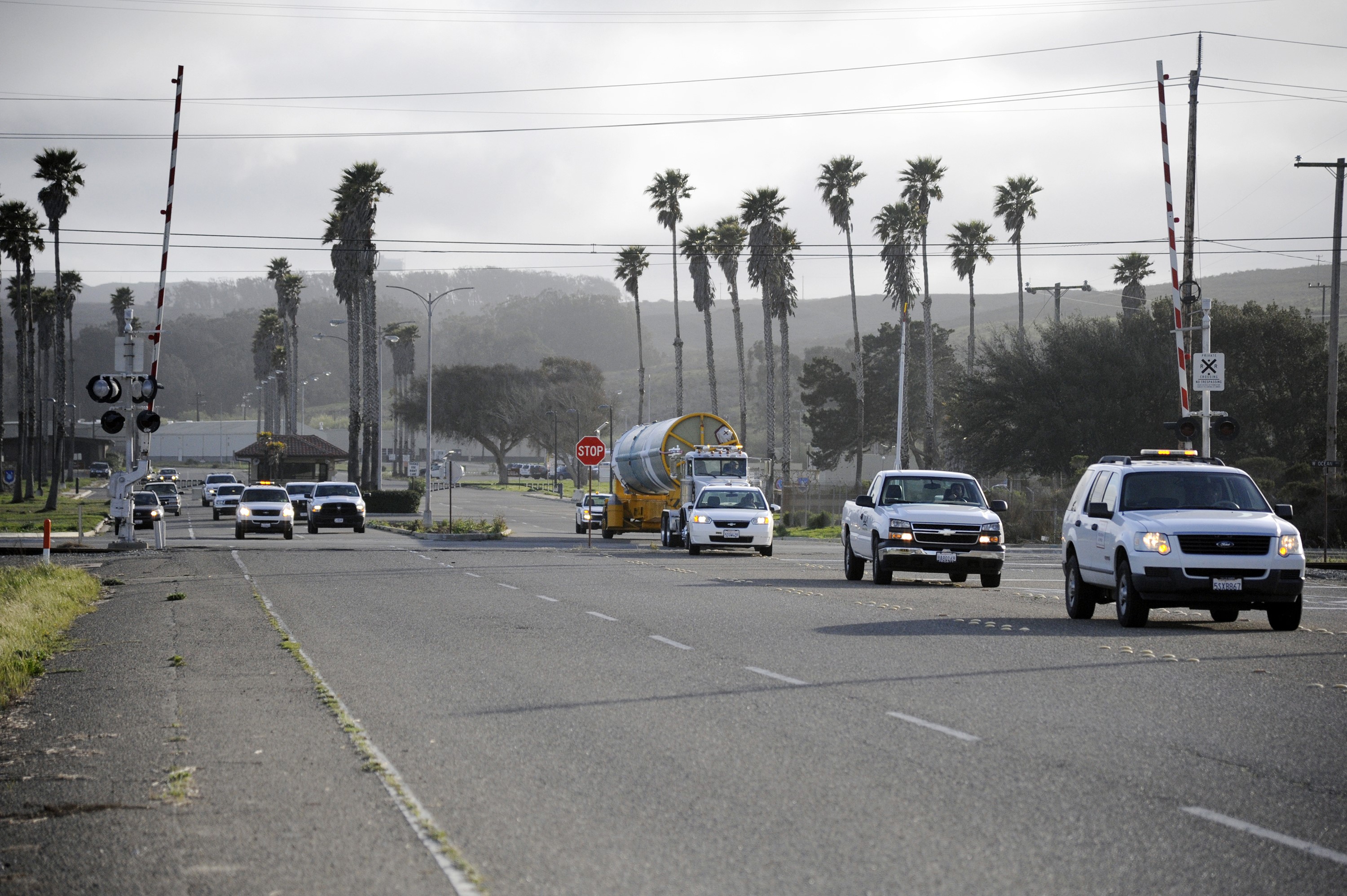 VANDENBERG AIR FORCE BASE, Calif. – The Delta first-stage booster for NASA's Orbiting Carbon Observatory-2 mission, or OCO-2, is escorted through the traffic on the roads at Vandenberg Air Force Base in California on its move from the Building 836 hangar to the Horizontal Processing Facility at Space Launch Complex 2. OCO-2 is scheduled to launch aboard a United Launch Alliance Delta II rocket on July 1, 2014. The observatory will collect precise global measurements of carbon dioxide in the Earth's atmosphere and provide scientists with a better idea of the chemical compound's impacts on climate change. Scientists will analyze this data to improve our understanding of the natural processes and human activities that regulate the abundance and distribution of this important atmospheric gas. To learn more about OCO-2, visit http://oco.jpl.nasa.gov. Photo credit: NASA/D. Liberotti, 30th Space Wing, VAFB