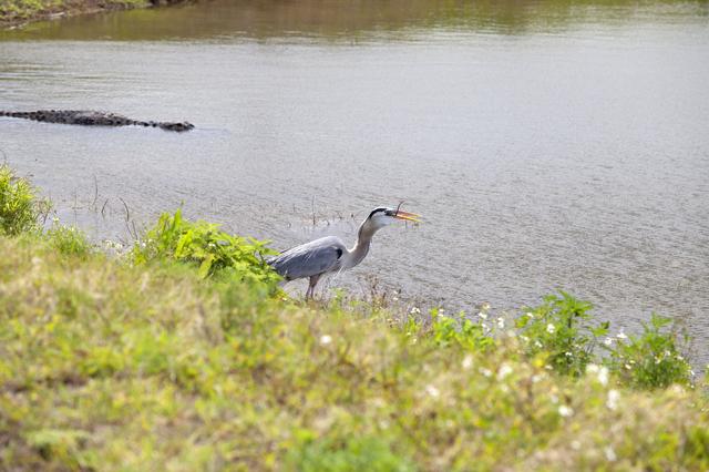 CAPE CANAVERAL, Fla. – A great blue heron consumes a small rodent along the shore of an inland waterway at NASA's Kennedy Space Center in Florida. An alligator swims in the water nearby. The center shares a boundary with the Merritt Island National Wildlife Refuge. The refuge encompasses 140,000 acres that are a habitat for more than 330 species of birds, 31 mammals, 117 fishes, and 65 amphibians and reptiles. It contains more than 1,000 known plant species. The marshes and open water of the refuge provide wintering areas for 23 species of migratory waterfowl, as well as a year-round home for great blue herons, great egrets, wood storks, cormorants, brown pelicans and other species of marsh and shore birds, and a variety of insects. Photo credit: NASA/Daniel Casper