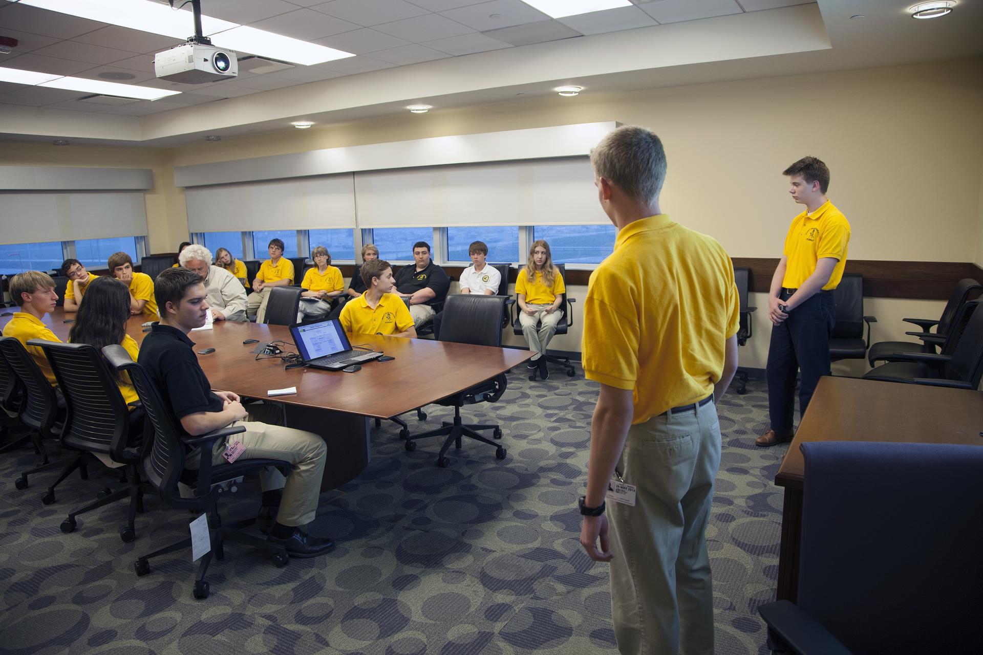 CAPE CANAVERAL, Fla. – Students representing a team from Merritt Island High School present their StangSat concepts to NASA engineers at a Critical Design Review in the Operations and Checkout Building at NASA's Kennedy Space Center in Florida. StangSat is one of many CubeSats under development in a class of research spacecraft called nanosatellites. The cube-shaped satellites measure about 4 inches on each side, have a volume of about 1 quart and weigh less than 3 pounds. To date, 27 CubeSats have launched through the initiative as part of the agency's Launch Services Program's Educational Launch of Nanosatellite Program. This year, four separate launches will carry 17 CubeSats. To learn more about the CubeSat Launch Initiative, visit http://go.nasa.gov/CubeSat_initiative. Photo credit: NASA/Ben Smegelsky