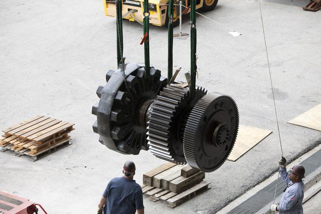 CAPE CANAVERAL, Fla. - Inside the Vehicle Assembly Building at NASA’s Kennedy Space Center in Florida, ground support technicians monitor the progress as an overhead crane moves one of the sprocket shaft assemblies away from the C truck of crawler-transporter 2, or CT-2. The sprocket assemblies will be placed into shipping cradles on pallets and positioned on a flatbed trailer. They will be sent to a vendor for inspections and refurbishment. Work continues in high bay 2 to upgrade CT-2. The modifications are designed to ensure CT-2’s ability to transport launch vehicles currently in development, such as the agency’s Space Launch System, to the launch pad. The Ground Systems Development and Operations Program office at Kennedy is overseeing the upgrades. For more than 45 years the crawler-transporters were used to transport the mobile launcher platform and the Apollo-Saturn V rockets and, later, space shuttles to Launch Pads 39A and B. For more information, visit: http://www.nasa.gov/exploration/systems/ground/crawler-transporter. Photo credit: NASA/Dimitri Gerondidakis