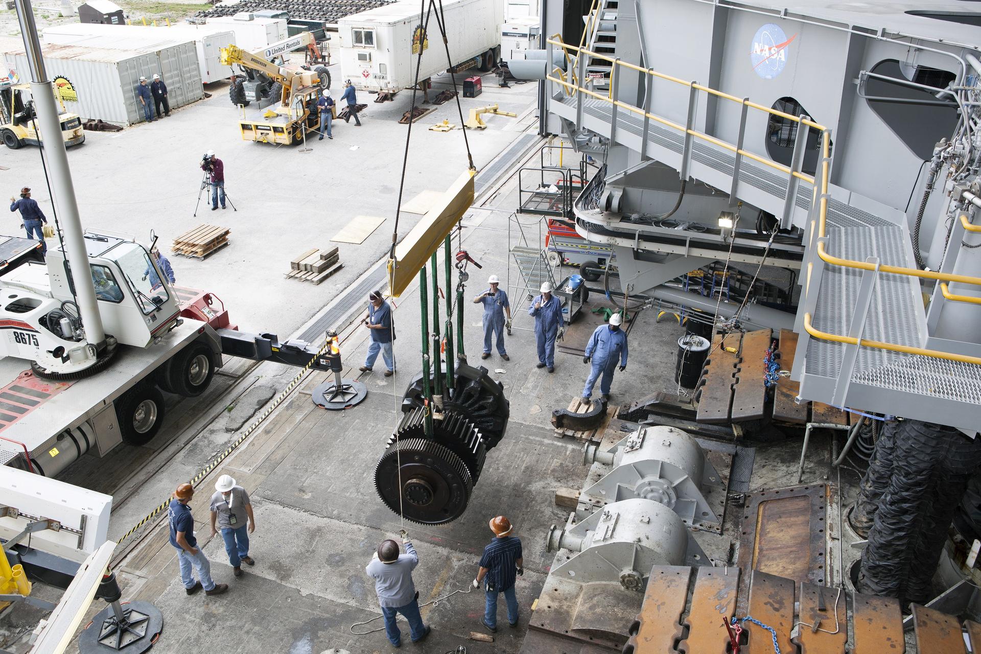 CAPE CANAVERAL, Fla. - Inside the Vehicle Assembly Building at NASA’s Kennedy Space Center in Florida, ground support technicians monitor the progress as an overhead crane lifts a sprocket shaft assembly away from the C truck of crawler-transporter 2, or CT-2. A section of the treads on the C truck were removed to allow access to the sprocket assemblies. The sprocket assemblies will be placed into shipping cradles on pallets and positioned on a flatbed trailer. The assemblies will be sent to a vendor for inspections and refurbishment. Work continues in high bay 2 to upgrade CT-2. The modifications are designed to ensure CT-2’s ability to transport launch vehicles currently in development, such as the agency’s Space Launch System, to the launch pad. The Ground Systems Development and Operations Program office at Kennedy is overseeing the upgrades. For more than 45 years the crawler-transporters were used to transport the mobile launcher platform and the Apollo-Saturn V rockets and, later, space shuttles to Launch Pads 39A and B. For more information, visit: http://www.nasa.gov/exploration/systems/ground/crawler-transporter. Photo credit: NASA/Dimitri Gerondidakis
