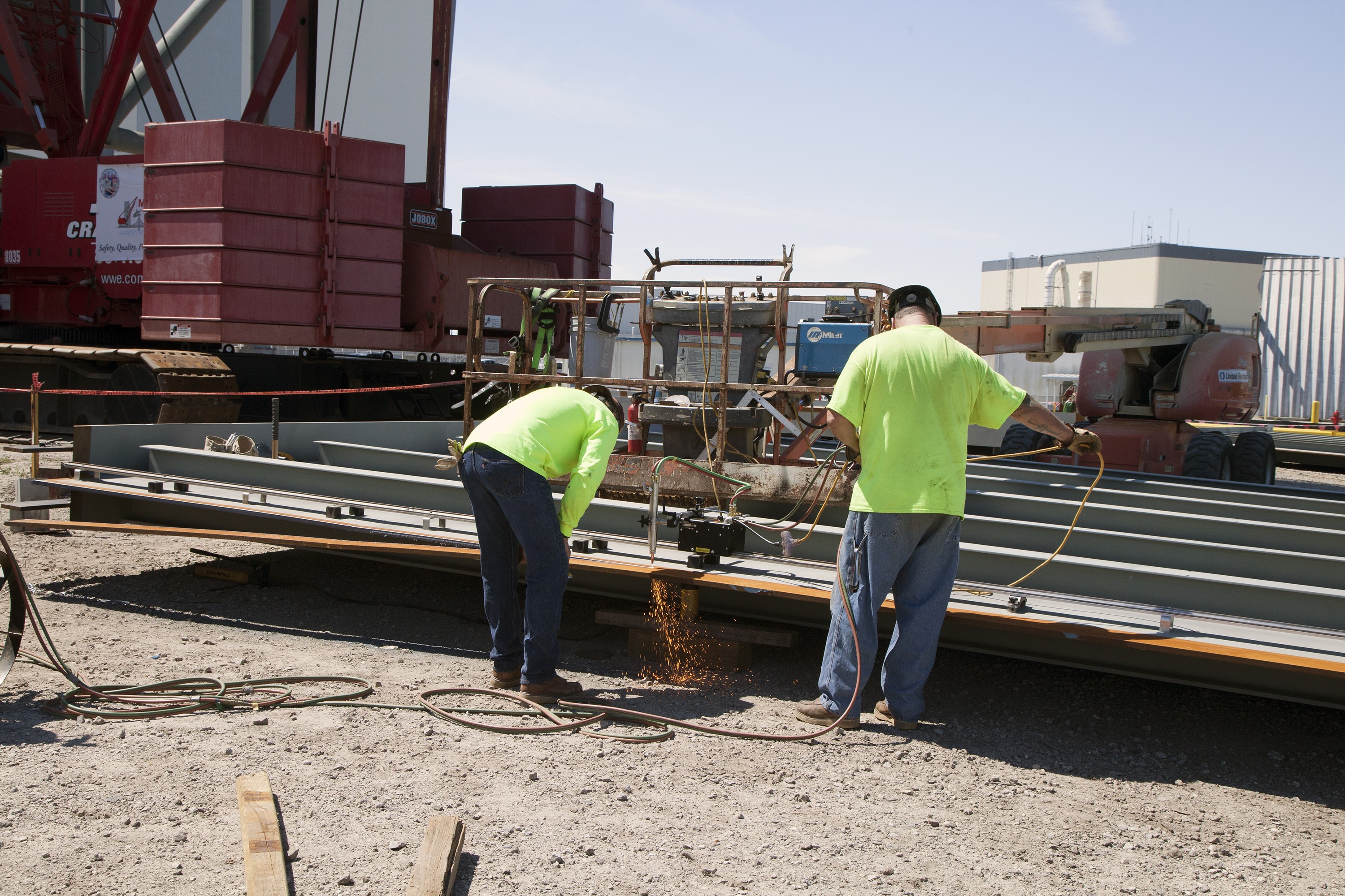 CAPE CANAVERAL, Fla. -- Modifications continue on the Mobile Launcher, or ML, at the Mobile Launcher Park Site at NASA’s Kennedy Space Center in Florida. Construction workers use an automated cutting tool to precisely trim a small section from one of the steel walls for the exterior of the ML. In 2013, the agency awarded a contract to J.P. Donovan Construction Inc. of Rockledge, Fla., to modify the ML, which is one of the key elements of ground support equipment that is being upgraded by the Ground Systems Development and Operations Program office at Kennedy. The ML will carry the SLS rocket and Orion spacecraft to Launch Pad 39B for its first mission, Exploration Mission 1, in 2017. Photo credit: NASA/Daniel Casper
