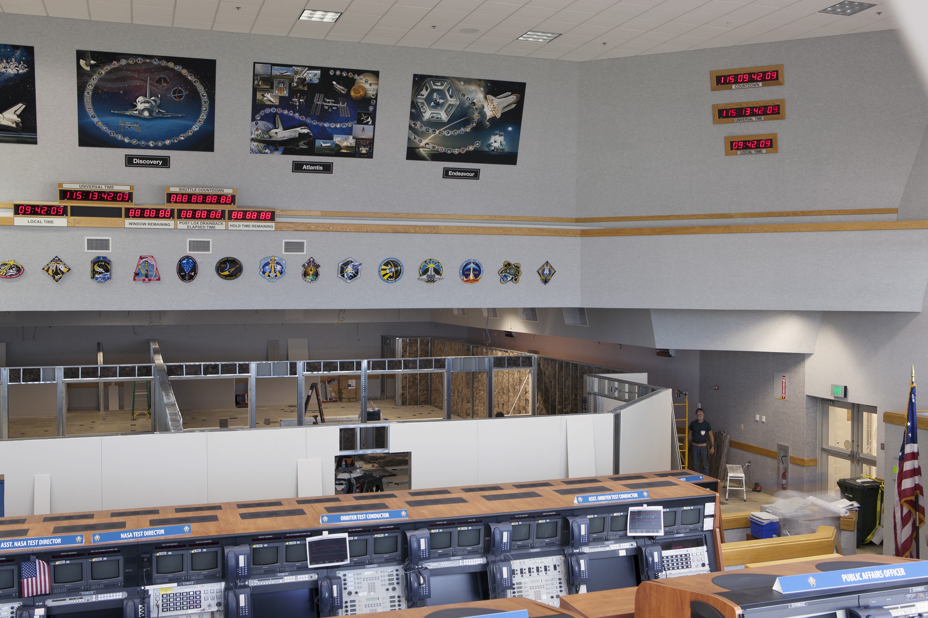 CAPE CANAVERAL, Fla. – Construction workers have installed the framing and some of the inner walls inside Firing Room 4 in the Launch Control Center at NASA's Kennedy Space Center in Florida. Three rows of upper level management consoles remain. The Ground Systems Development and Operations Program is overseeing efforts to create a new firing room based on a multi-user concept. The design of Firing Room 4 will incorporate five control room areas that are flexible to meet current and future NASA and commercial user requirements. The equipment and most of the consoles from Firing Room 4 were moved to Firing Room 2 for possible future reuse. Photo credit: NASA/Dimitri Gerondidakis