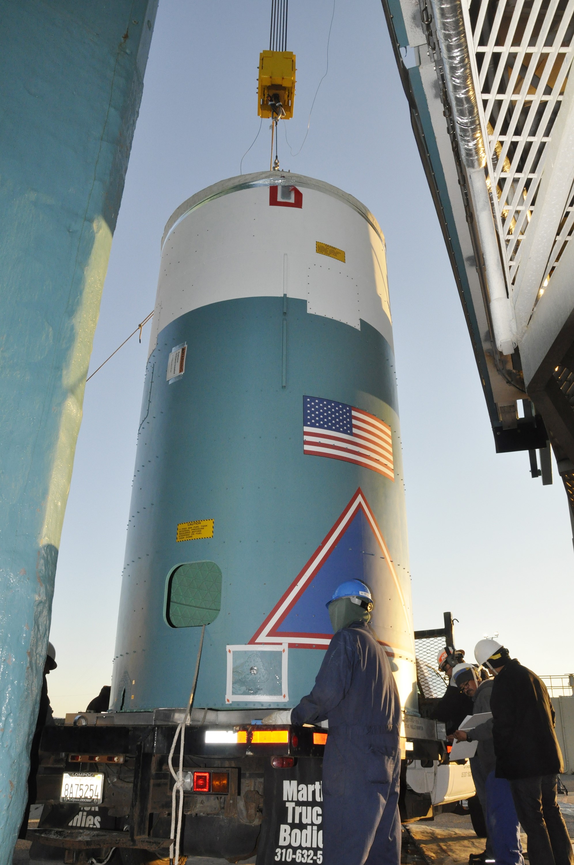 VANDENBERG AIR FORCE BASE, Calif. – Workers prepare to lift the interstage adapter, or ISA, for NASA's Orbiting Carbon Observatory-2 mission, or OCO-2, by crane into the mobile service tower at Space Launch Complex 2 on Vandenberg Air Force Base in California. OCO-2 is scheduled to launch into a polar Earth orbit aboard a United Launch Alliance Delta II 7320-10C rocket in July. The ISA is the interface between the Delta II first and second stages. The second stage engine fits within the ISA. Once in orbit, OCO-2 will collect precise global measurements of carbon dioxide in the Earth's atmosphere and provide scientists with a better idea of the chemical compound's impacts on climate change. Scientists will analyze this data to improve our understanding of the natural processes and human activities that regulate the abundance and distribution of this important atmospheric gas. To learn more about OCO-2, visit http://oco.jpl.nasa.gov. Photo credit: NASA/Randy Beaudoin