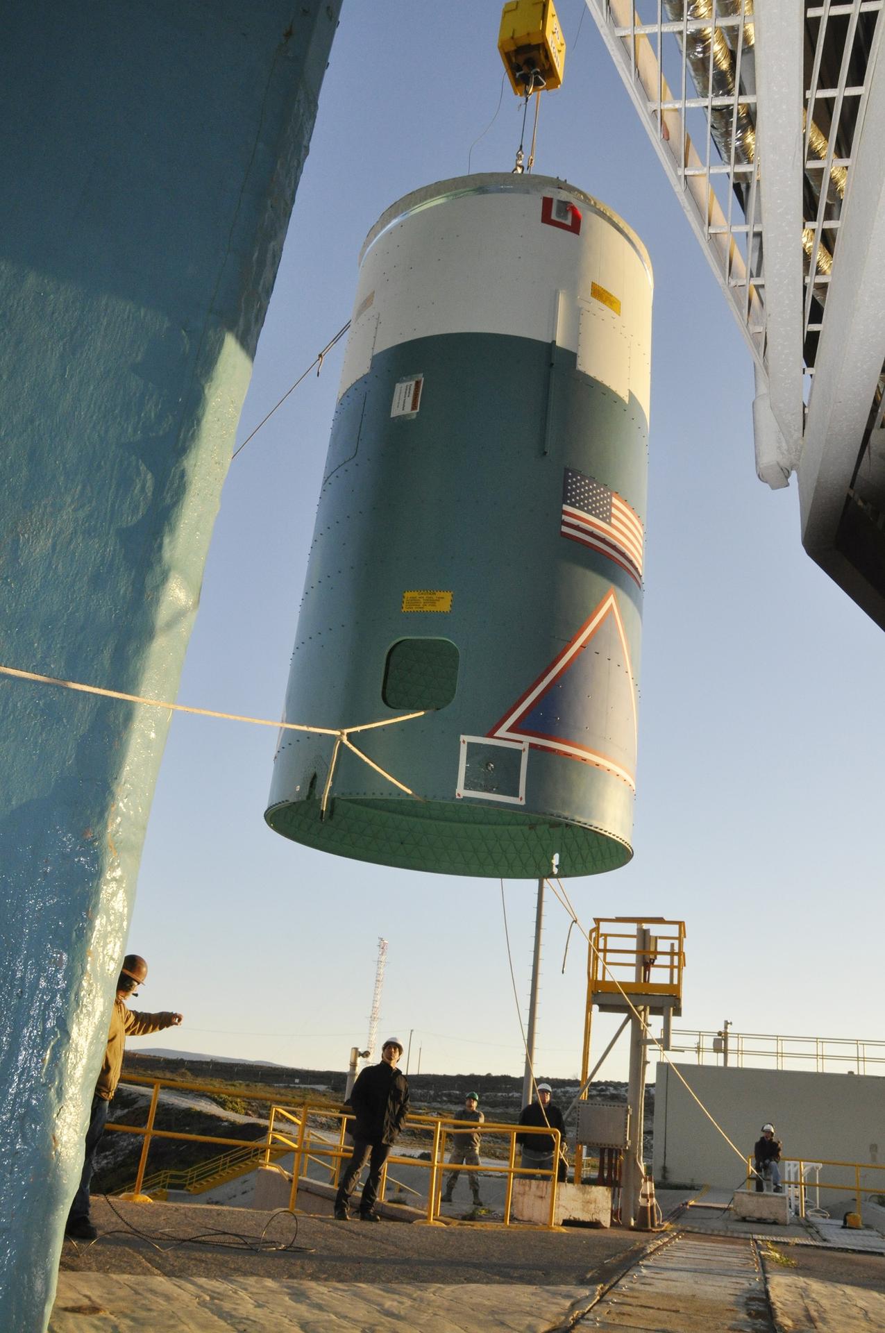 VANDENBERG AIR FORCE BASE, Calif. – A crane lifts the interstage adapter, or ISA, for NASA's Orbiting Carbon Observatory-2 mission, or OCO-2, up the side of the mobile service tower at Space Launch Complex 2 on Vandenberg Air Force Base in California. OCO-2 is scheduled to launch into a polar Earth orbit aboard a United Launch Alliance Delta II 7320-10C rocket in July. The ISA is the interface between the Delta II first and second stages. The second stage engine fits within the ISA. Once in orbit, OCO-2 will collect precise global measurements of carbon dioxide in the Earth's atmosphere and provide scientists with a better idea of the chemical compound's impacts on climate change. Scientists will analyze this data to improve our understanding of the natural processes and human activities that regulate the abundance and distribution of this important atmospheric gas. To learn more about OCO-2, visit http://oco.jpl.nasa.gov. Photo credit: NASA/Randy Beaudoin