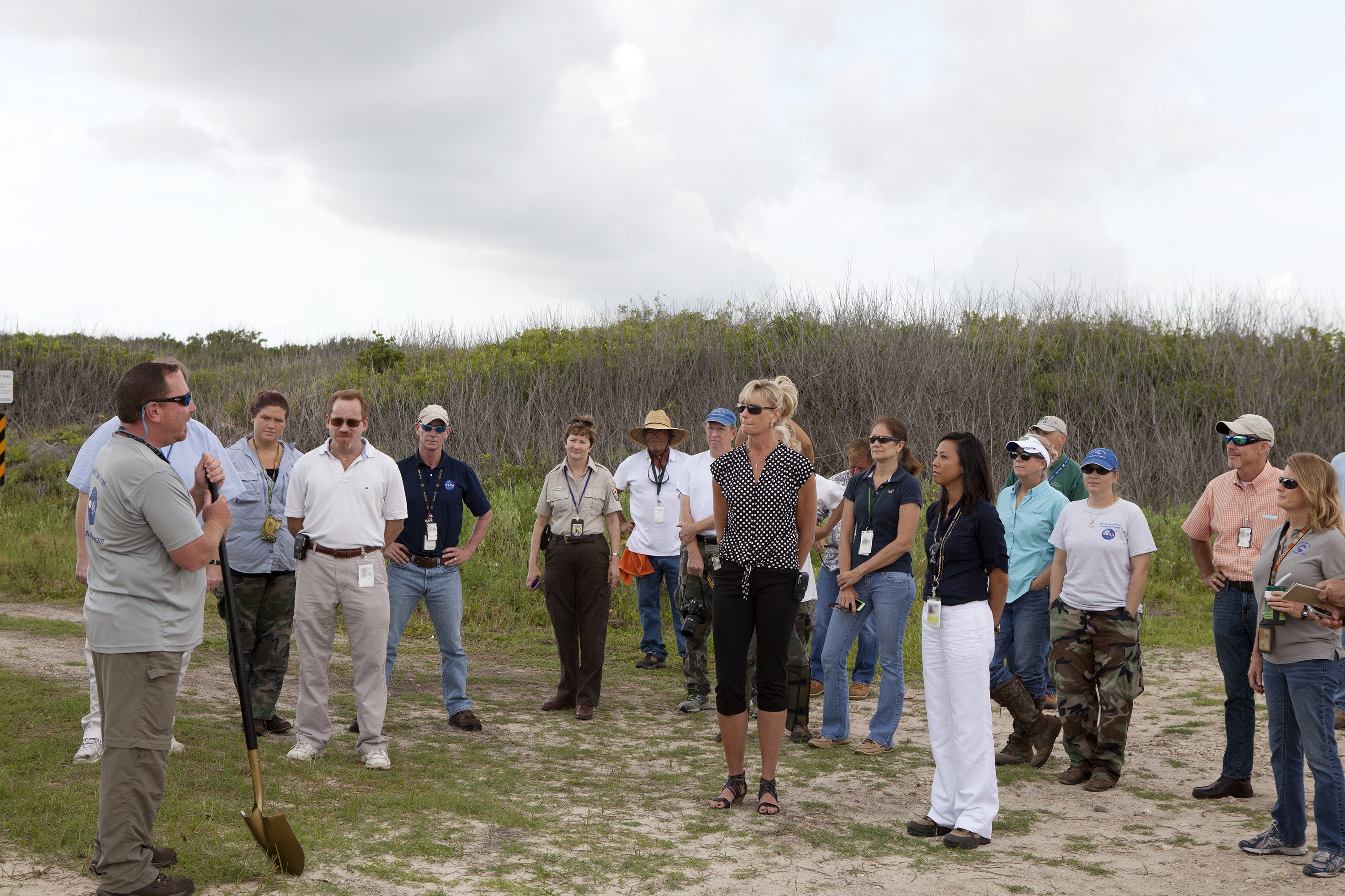 CAPE CANAVERAL, Fla. -- At the Kennedy Space Center in Florida, Don Dankert, a biological scientist in the NASA Environmental Management Branch of Center Operations, far left, speaks to guests during ceremonies to commemorate the completion of a six-month effort to restore 1.2 mile stretch of shoreline near Launch Pads 39A and B. To help prevent erosion, 180,000 shrubs, including grasses, sunflowers, vines, sea grapes and palmettos also were planted on the new dunes. Constant pounding from tropical storms, such as Hurricane Sandy in October of 2012, other weather systems and higher than usual tides, destroyed sand dunes protecting infrastructure at the spaceport. Photo credit: NASA/Dan Casper