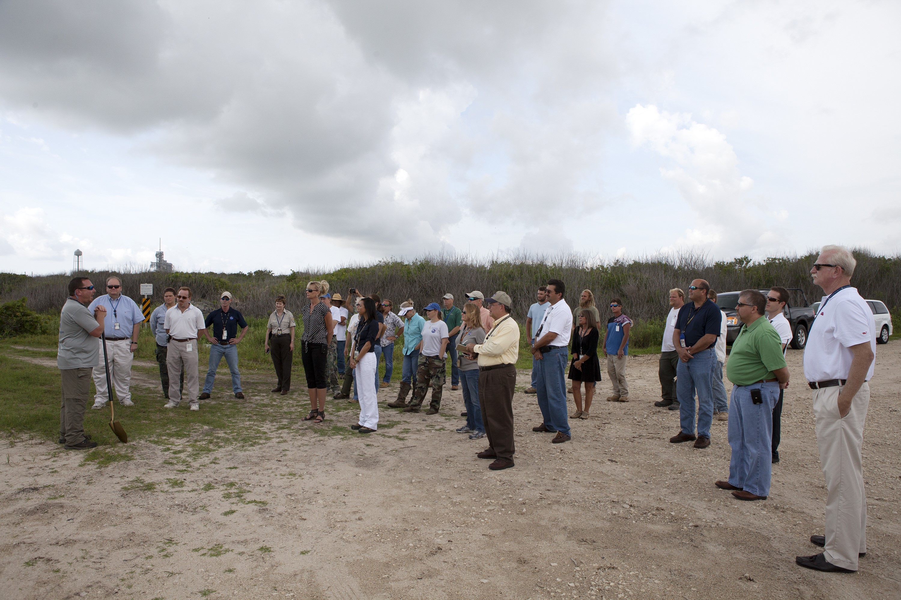 CAPE CANAVERAL, Fla. -- At the Kennedy Space Center in Florida, Don Dankert, a biological scientist in the NASA Environmental Management Branch of Center Operations, far left, speaks to guests during ceremonies to commemorate the completion of a six-month effort to restore 1.2 mile stretch of shoreline near Launch Pads 39A and B. To help prevent erosion, 180,000 shrubs, including grasses, sunflowers, vines, sea grapes and palmettos also were planted on the new dunes. Constant pounding from tropical storms, such as Hurricane Sandy in October of 2012, other weather systems and higher than usual tides, destroyed sand dunes protecting infrastructure at the spaceport. Photo credit: NASA/Dan Casper