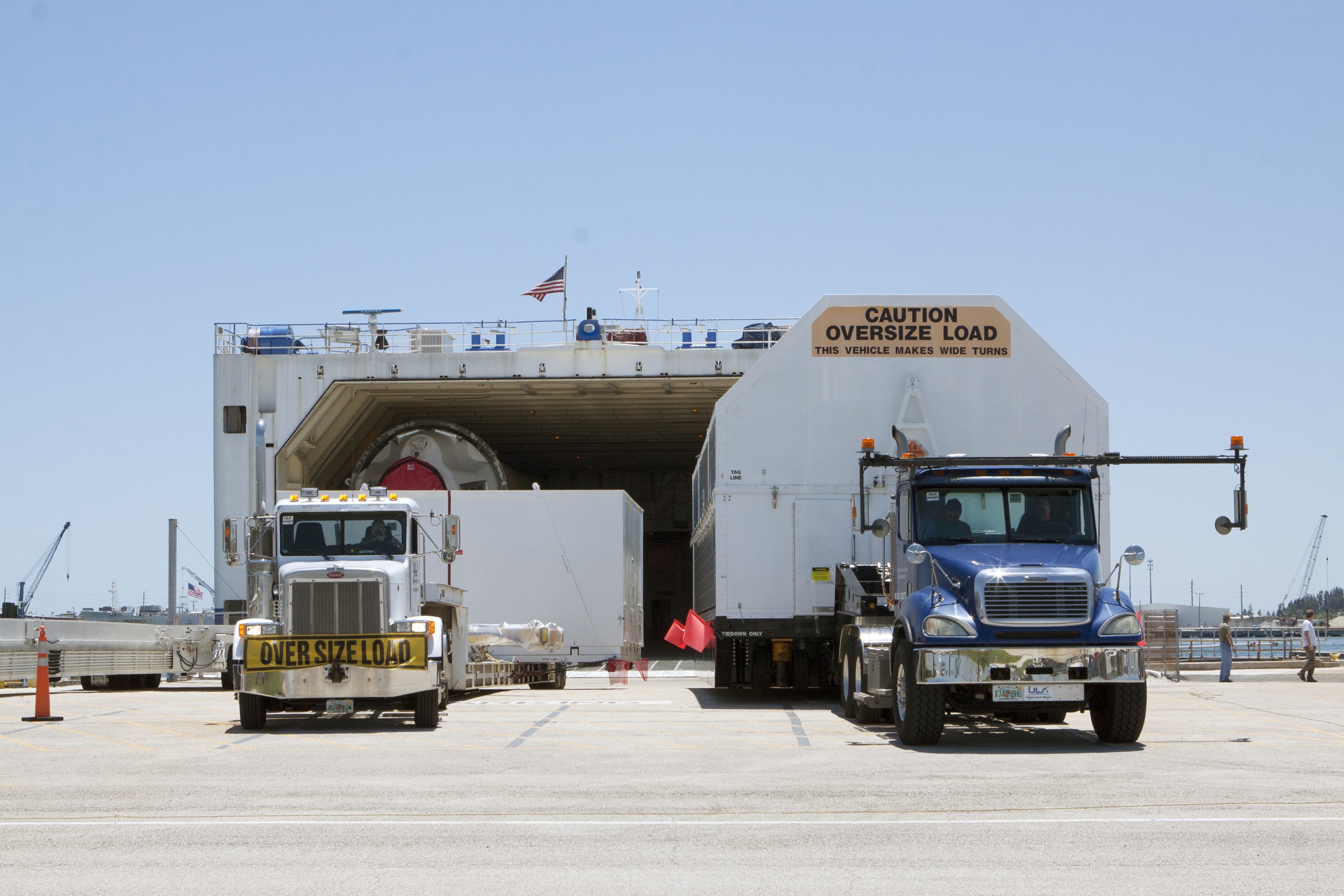 CAPE CANAVERAL, Fla. -- A barge has arrived at the U.S. Army Outpost wharf at Port Canaveral in Florida, carrying the second stage, port booster and spacecraft adapter, the remaining stages for the United Launch Alliance Delta IV Heavy boosters for NASA’s upcoming Exploration Flight Test-1, or EFT-1, mission with the Orion spacecraft. The segments are being offloaded in their containers for transport to the Horizontal Integration Facility, or HIF, at Space Launch Complex 37 on Cape Canaveral Air Force Station. At the HIF, all three booster stages will be processed and checked out before being moved to the nearby launch pad and hoisted into position. The spacecraft adapter will connect Orion to the ULA Delta IV, and also will connect Orion to NASA's new rocket, the Space Launch System, on its first mission in 2017. During the EFT-1 mission, Orion will travel farther into space than any human spacecraft has gone in more than 40 years. The data gathered during the flight will influence design decisions, validate existing computer models and innovative new approaches to space systems development, as well as reduce overall mission risks and costs for later Orion flights. Liftoff of Orion on EFT-1 is planned for fall 2014. Photo credit: NASA/Kim Shiflett