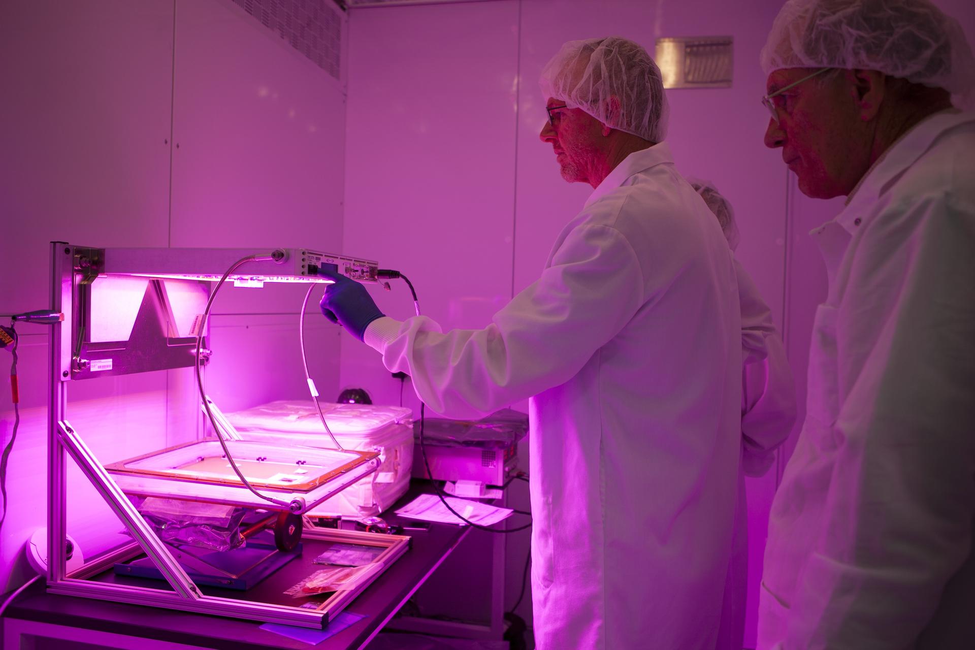 CAPE CANAVERAL, Fla. – Researchers activate the red, blue and green LED lights on the Veggie plant growth system inside a control chamber at the Space Station Processing Facility at NASA's Kennedy Space Center in Florida. From left, are Jim Smodell, a technician with SGT, and Chuck Spern, lead project engineer, with QinetiQ North America. The growth chamber will be used as a control unit and procedures will be followed identical to those being performed on Veggie and the Veg-01 experiment on the International Space Station by Expedition 39 flight engineer and NASA astronaut Steve Swanson. Veggie and Veg-01 were delivered to the space station aboard the SpaceX-3 mission. Veggie is the first fresh food production system delivered to the station. Six plant pillows, each containing outredgeous red romaine lettuce seeds and a root mat were inserted into Veggie. The plant chamber's red, blue and green LED lights were activated. The plant growth will be monitored for 28 days. At the end of the cycle, the plants will be carefully harvested, frozen and stored for return to Earth. Photo credit: NASA/Dimitri Gerondidakis