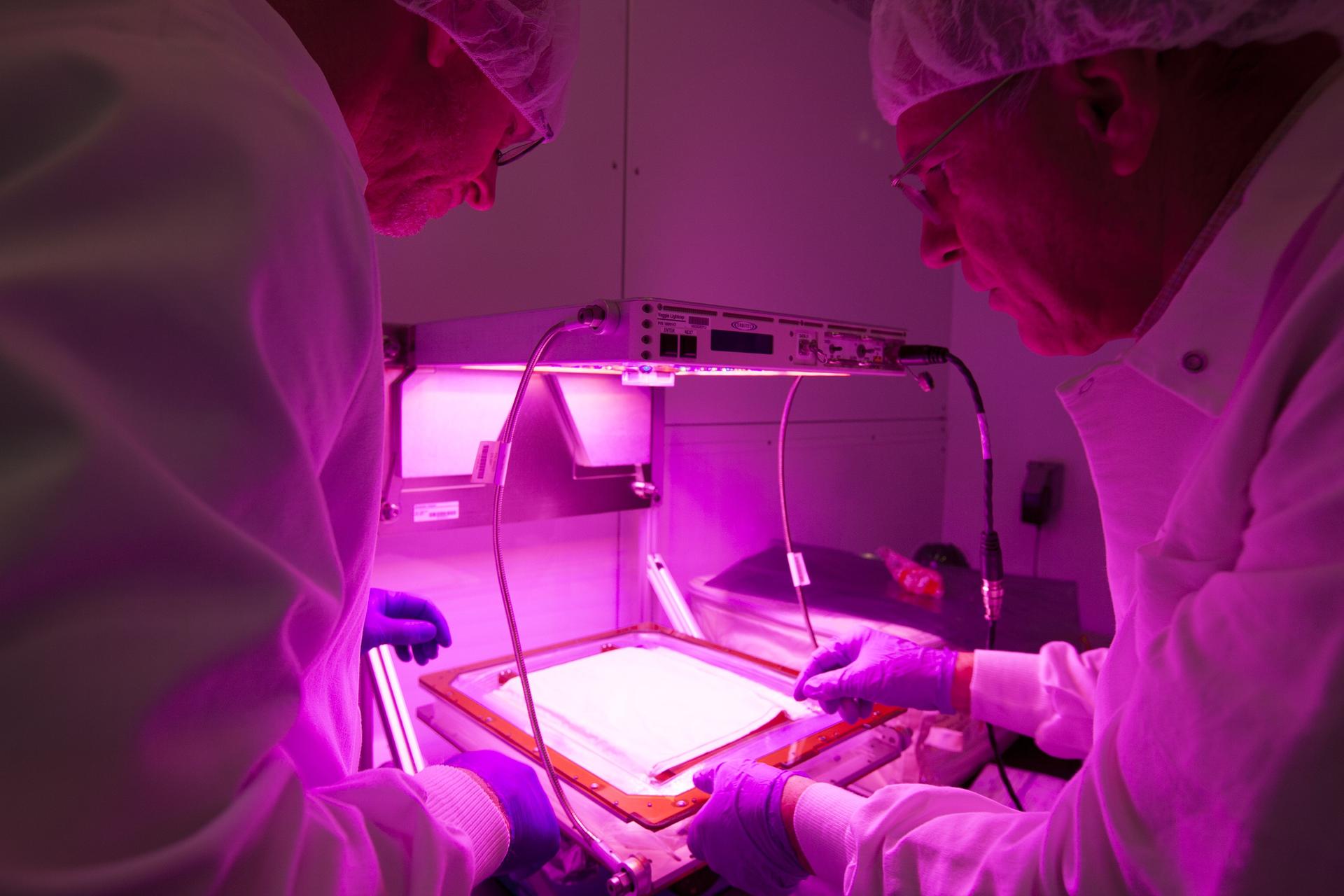 CAPE CANAVERAL, Fla. – Researchers have activated the red, blue and green LED lights on the Veggie plant growth system inside a control chamber at the Space Station Processing Facility at NASA's Kennedy Space Center in Florida. From left, are Jim Smodell, a technician with SGT, and Chuck Spern, lead project engineer with QinetiQ North America. The growth chamber will be used as a control unit and procedures will be followed identical to those being performed on Veggie and the Veg-01 experiment on the International Space Station by Expedition 39 flight engineer and NASA astronaut Steve Swanson. Veggie and Veg-01 were delivered to the space station aboard the SpaceX-3 mission. Veggie is the first fresh food production system delivered to the station. Six plant pillows, each containing outredgeous red romaine lettuce seeds and a root mat were inserted into Veggie. The plant chamber's red, blue and green LED lights were activated. The plant growth will be monitored for 28 days. At the end of the cycle, the plants will be carefully harvested, frozen and stored for return to Earth. Photo credit: NASA/Dimitri Gerondidakis