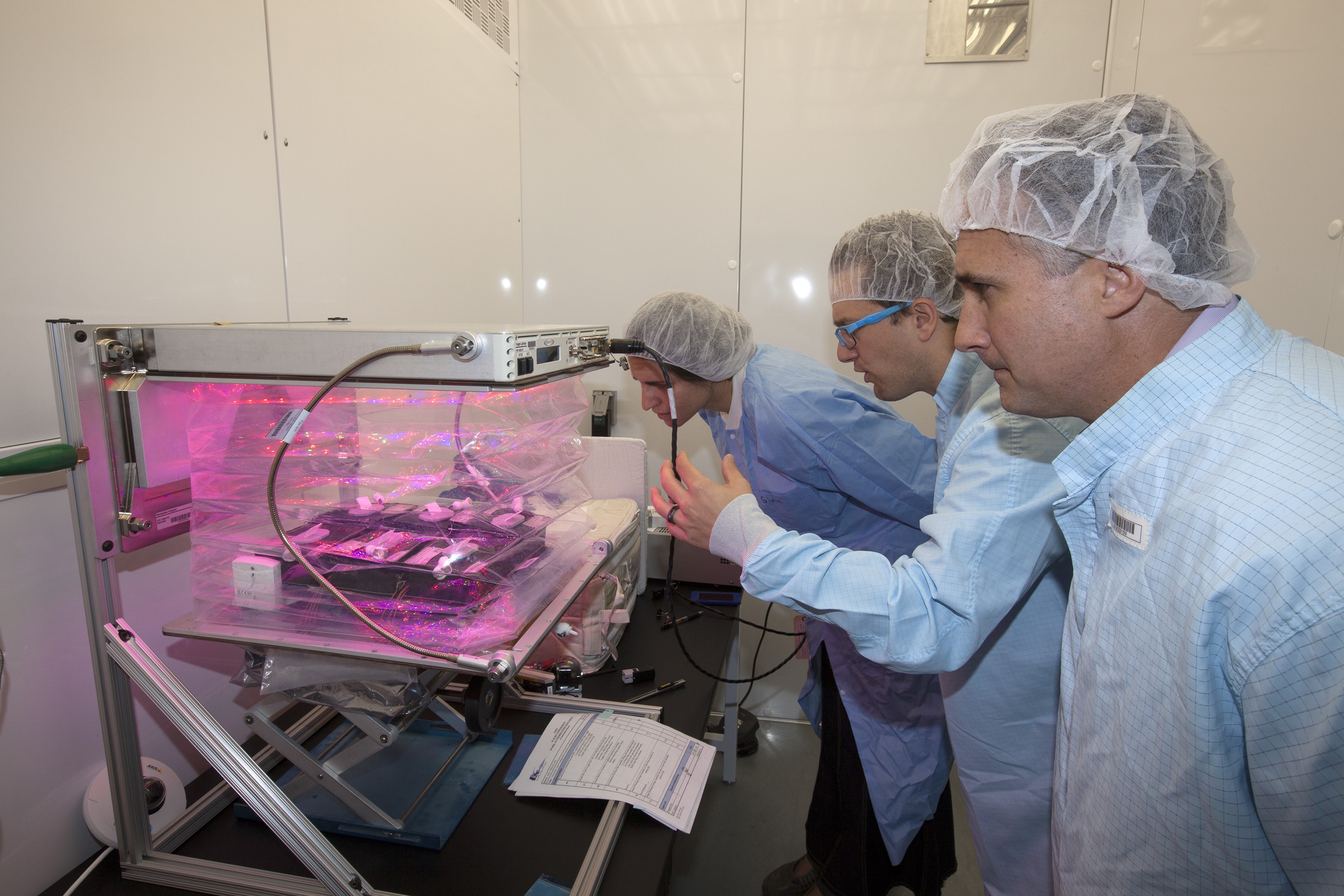 CAPE CANAVERAL, Fla. – The Veggie plant growth system has been activated inside a control chamber at the Space Station Processing Facility at NASA's Kennedy Space Center in Florida. The red, blue and green LED lights have been turned on and the root mat and plant pillows containing outredgeous red romaine lettuce seeds have been inserted into the chamber. The clear bellows have been expanded and secured. Checking the system are, from left, Gioia Massa, NASA payload scientist for Veggie, Gerard Newsham, Veggie payload support specialist with Jacobs Technology, and Trent Smith, NASA project manager. The growth chamber will be used as a control unit and procedures will be followed identical to those being performed on Veggie and the Veg-01 experiment on the International Space Station by Expedition 39 flight engineer and NASA astronaut Steve Swanson. Veggie and Veg-01 were delivered to the space station aboard the SpaceX-3 mission. Veggie is the first fresh food production system delivered to the station. Six plant pillows, each containing outredgeous red romaine lettuce seeds and a root mat were inserted into Veggie. The plant chamber's red, blue and green LED lights were activated. The plant growth will be monitored for 28 days. At the end of the cycle, the plants will be carefully harvested, frozen and stored for return to Earth. Photo credit: NASA/Dimitri Gerondidakis