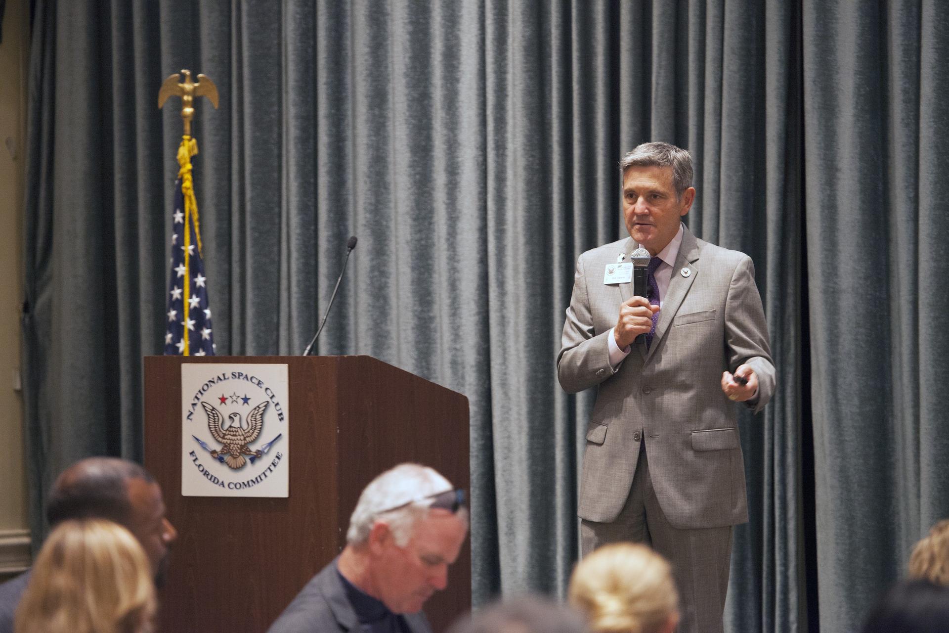 CAPE CANAVERAL, Fla. – Kennedy Space Center Director Bob Cabana speaks to National Space Club-Florida Chapter, or NSCFC, members and guests at the Radisson Resort at the Port in Cape Canaveral, Florida. Cabana's presentation included an overview of the new strategic plan and efforts to transform the center into a multi-user spaceport of the future. The NSCFC is a non-profit organization composed of representatives from the space industry, government, educational institutions, and private individuals who share a commitment to increasing public awareness of America's aerospace programs. Photo credit: Dimitri Gerondidakis