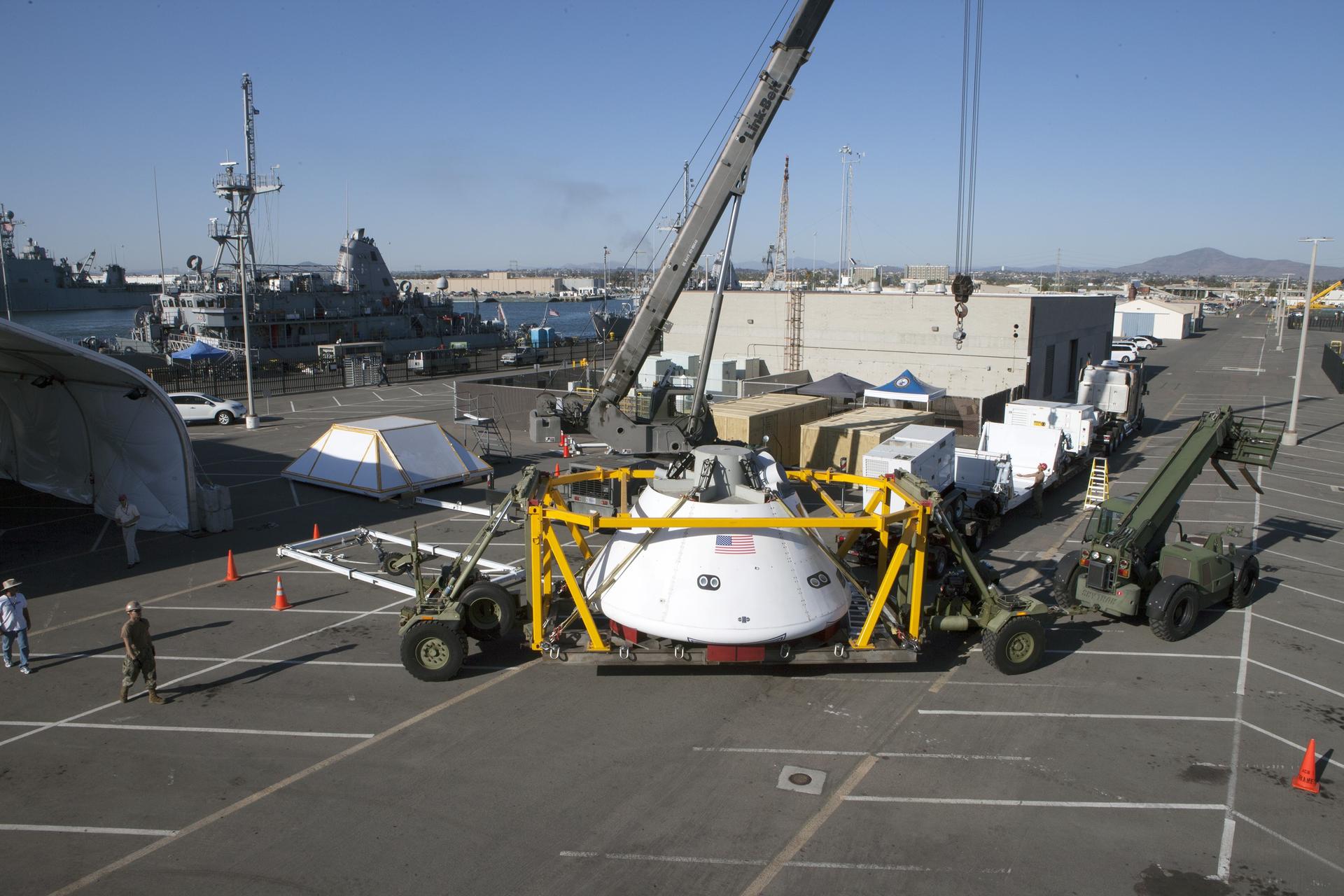 SAN DIEGO, Calif. – Workers simulate moving the Orion boilerplate test vehicle in place to be lifted into the crew module transportation fixture at the Mole Pier at Naval Base San Diego in California to a warehouse at the naval base. The test vehicle is attached to the crew module recovery cradle. The Ground Systems Development and Operations Program, Lockheed Martin and the U.S. Navy are evaluating the hardware and processes for preparing the Orion crew module for Exploration Flight Test-1, or EFT-1, for overland transport from the naval base to NASA's Kennedy Space Center in Florida. Orion is the exploration spacecraft designed to carry astronauts to destinations not yet explored by humans, including an asteroid and Mars. It will have emergency abort capability, sustain the crew during space travel and provide safe re-entry from deep space return velocities. The first unpiloted test flight of the Orion is scheduled to launch later this year atop a Delta IV rocket from Cape Canaveral Air Force Station in Florida to an altitude of 3,600 miles above the Earth's surface. The two-orbit, four-hour flight test will help engineers evaluate the systems critical to crew safety including the heat shield, parachute system and launch abort system. For more information, visit http://www.nasa.gov/orion. Photo credit: NASA/Kim Shiflett