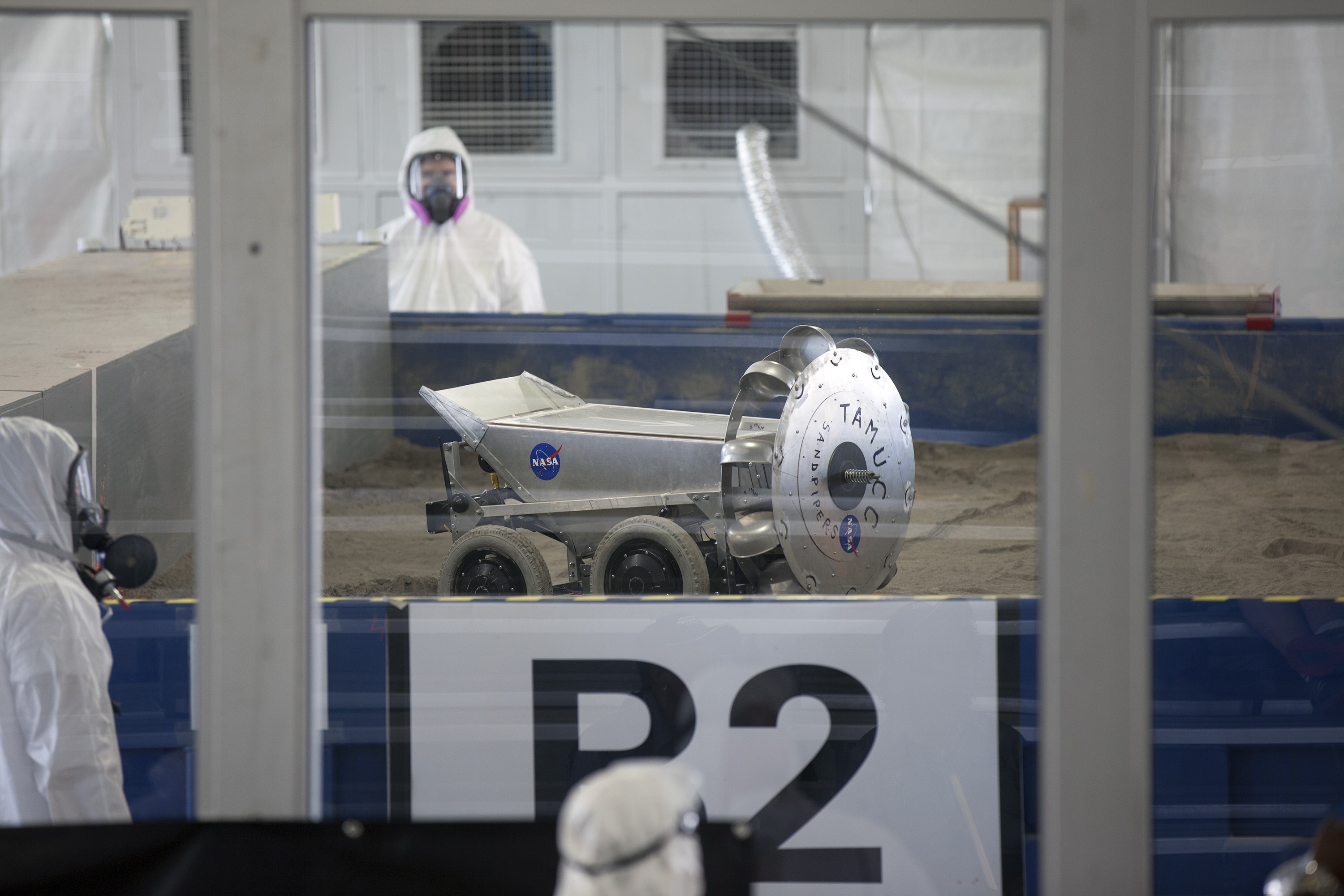 CAPE CANAVERAL, Fla. – Competition judges monitor the progress of a robot digging in the simulated Martian soil in the Caterpillar Mining Arena during NASA’s 2014 Robotic Mining Competition at the Kennedy Space Center Visitor Complex in Florida. More than 35 teams from colleges and universities around the U.S. have designed and built remote-controlled robots for the mining competition. The competition is a NASA Human Exploration and Operations Mission Directorate project designed to engage and retain students in science, technology, engineering and mathematics, or STEM, fields by expanding opportunities for student research and design. Teams use their remote-controlled robotics to maneuver and dig in a supersized sandbox filled with a crushed material that has characteristics similar to Martian soil. The objective of the challenge is to see which team’s robot can collect and move the most regolith within a specified amount of time. For more information, visit www.nasa.gov/nasarmc. Photo credit: NASA/Kim Shiflett