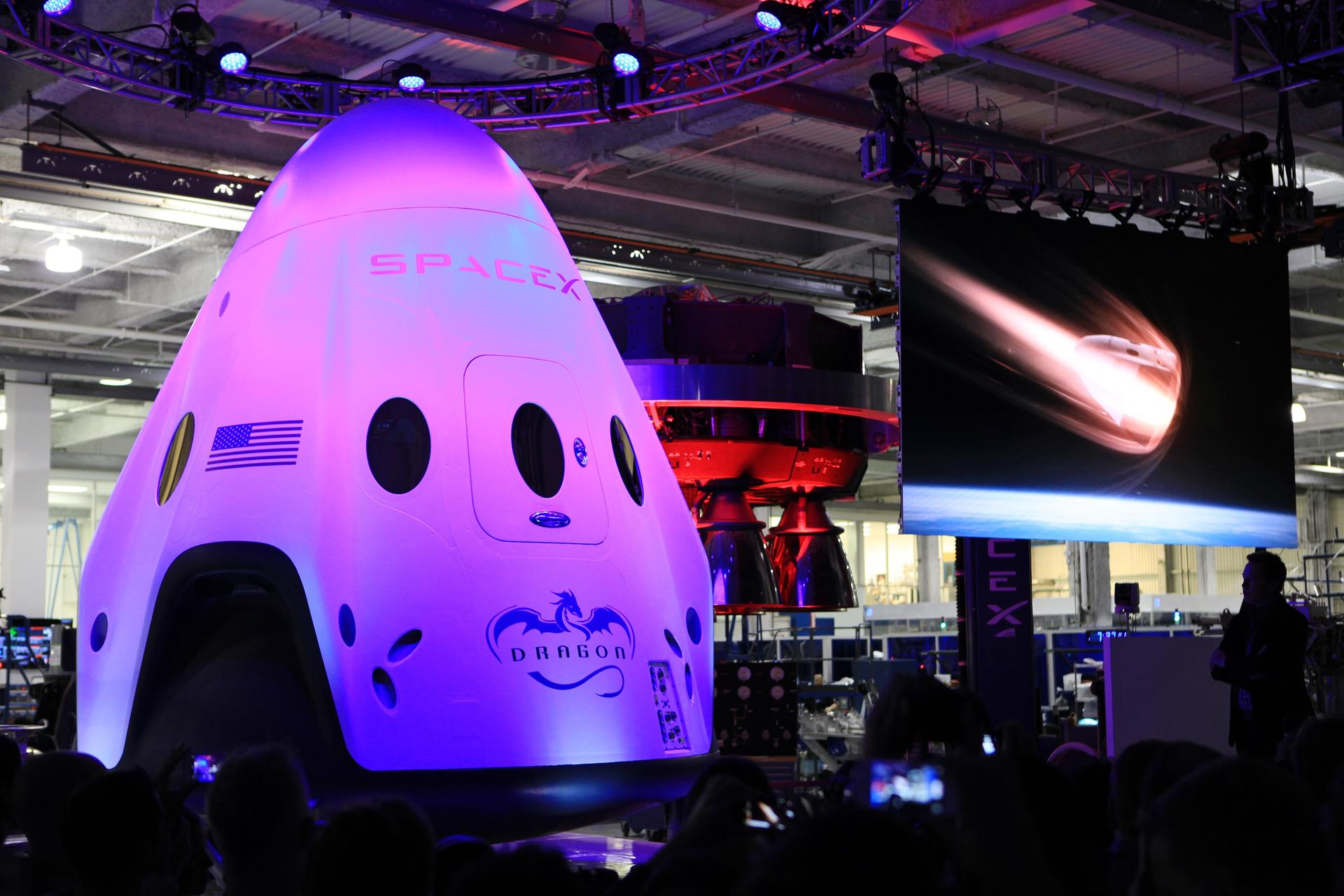 HAWTHORNE, Calif. - Animation showing the Dragon V2 spacecraft re-entering Earth's atmosphere plays beside the space during an unveiling ceremony inside SpaceX headquarters in Hawthorne, Calif. The spacecraft is designed to carry people into Earth's orbit and was developed in partnership with NASA's Commercial Crew Program under the Commercial Crew Integrated Capability agreement. SpaceX is one of NASA's commercial partners working to develop a new generation of U.S. spacecraft and rockets capable of transporting humans to and from Earth's orbit from American soil. Ultimately, NASA intends to use such commercial systems to fly U.S. astronauts to and from the International Space Station. Photo credit: NASA/Dimitri Gerondidakis