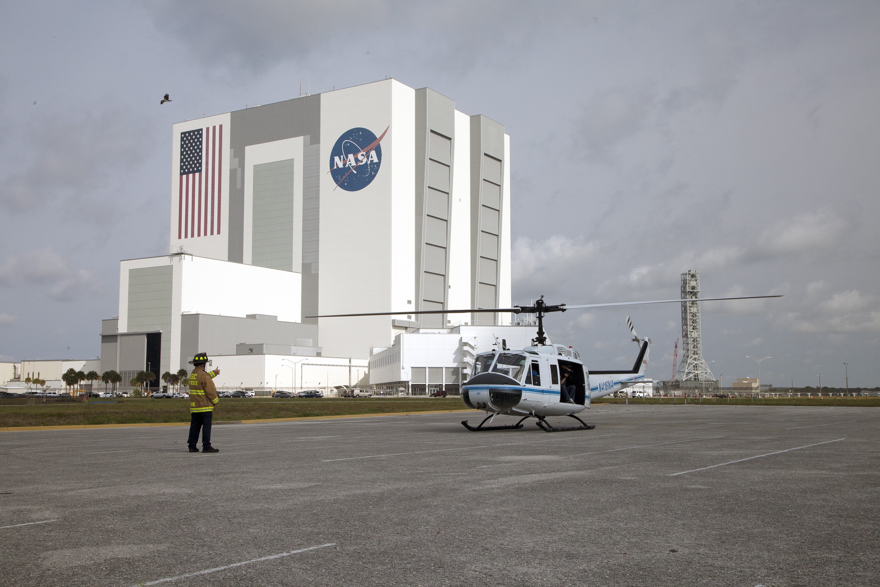 CAPE CANAVERAL, Fla. -- At NASA's Kennedy Space Center in Florida, agency Fire Rescue personnel direct an agency helicopter in for a landing during a training exercise. The activity taking place in Kennedy's Launch Complex 39 turn-basin parking lot was only one of several drills. It was part of a new training program that was developed by Kennedy's Fire Rescue department along with NASA Aircraft Operations to sharpen the skills needed to help rescue personnel learn how to collaborate with helicopter pilots in taking injured patients to hospitals as quickly as possible. Photo credit: NASA/Dan Casper
