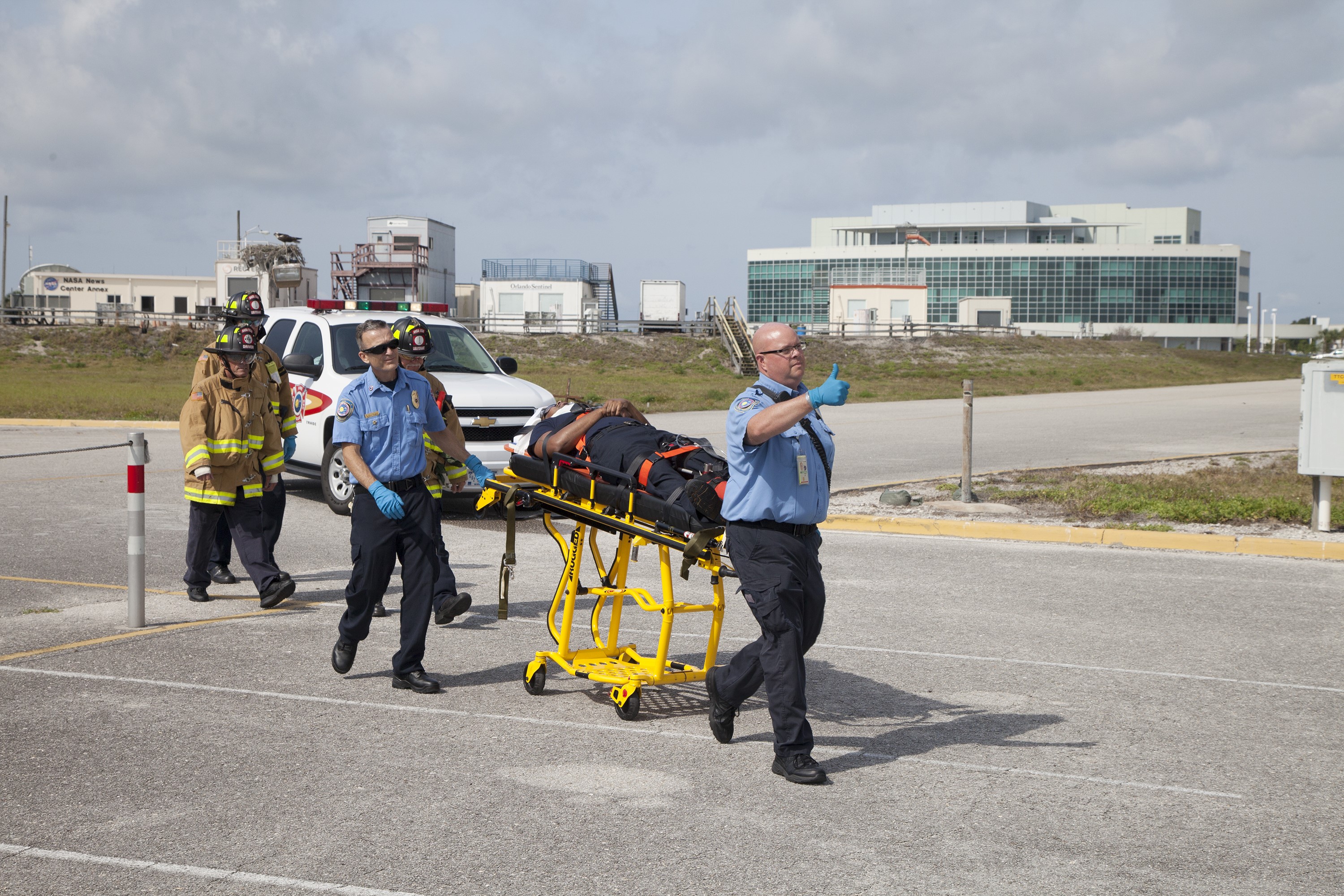 CAPE CANAVERAL, Fla. -- At NASA's Kennedy Space Center in Florida, paramedics and Fire Rescue personnel move a stretcher to the waiting helicopter as they work quickly to have the patient ready to transport after he was removed from a vehicle. The activity taking place in Kennedy's Launch Complex 39 turn-basin parking lot was only one of several drills. It was part of a new training program that was developed by Kennedy's Fire Rescue department along with NASA Aircraft Operations to sharpen the skills needed to help rescue personnel learn how to collaborate with helicopter pilots in taking injured patients to hospitals as quickly as possible. Photo credit: NASA/Dan Casper