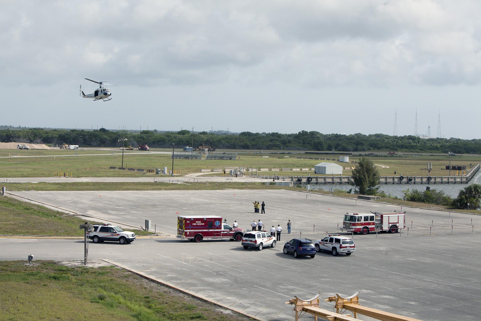 CAPE CANAVERAL, Fla. -- At NASA's Kennedy Space Center in Florida, an agency helicopter flies past the Vehicle Assembly Building prior to landing for a training exercise. The activity taking place in Kennedy's Launch Complex 39 turn-basin parking lot was only one of several drills. It was part of a new training program that was developed by Kennedy's Fire Rescue department along with NASA Aircraft Operations to sharpen the skills needed to help rescue personnel learn how to collaborate with helicopter pilots in taking injured patients to hospitals as quickly as possible. Photo credit: NASA/Dan Casper