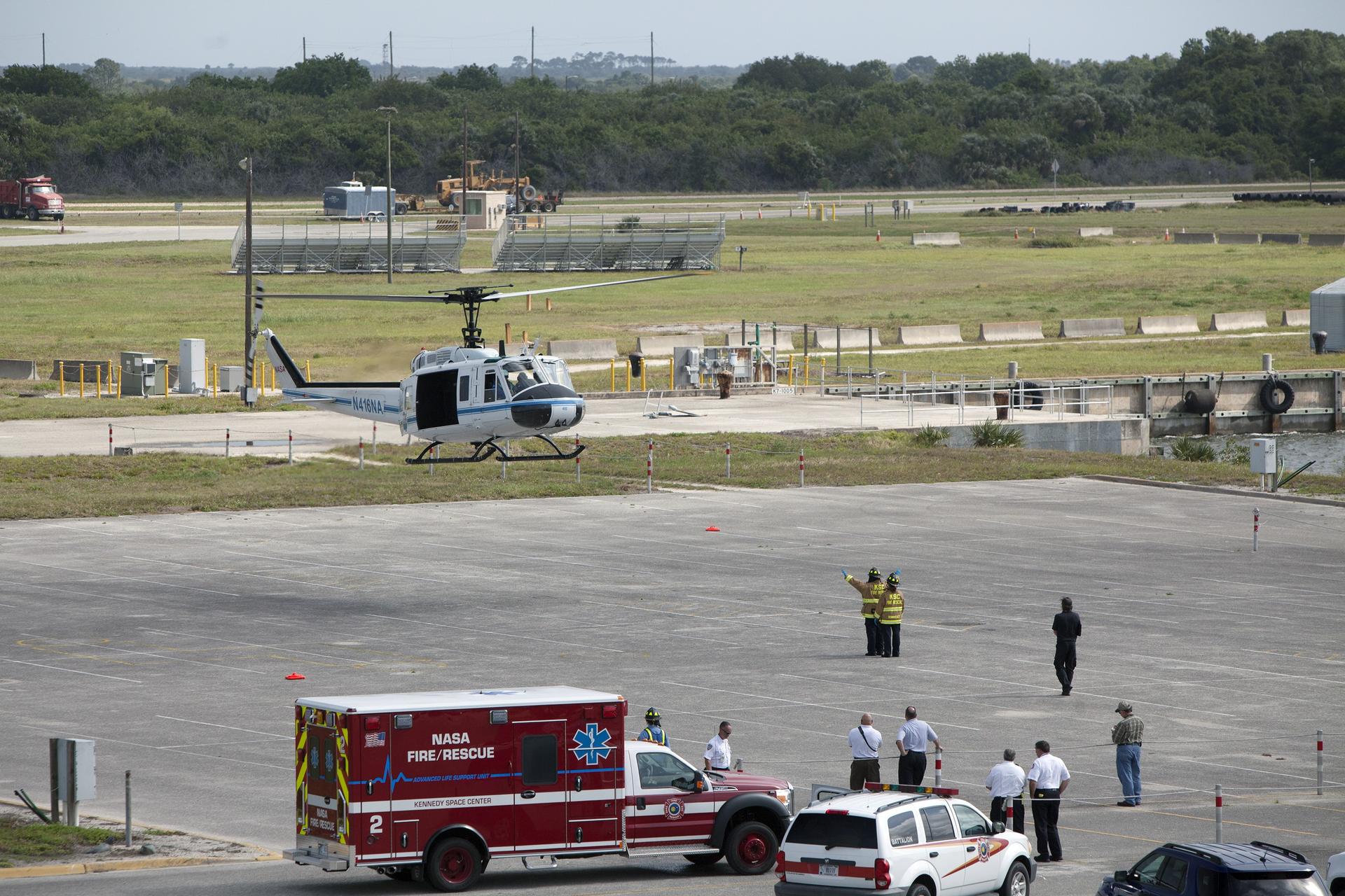 CAPE CANAVERAL, Fla. -- At NASA's Kennedy Space Center in Florida, an agency helicopter flies past the Vehicle Assembly Building prior to landing for a training exercise. The activity taking place in Kennedy's Launch Complex 39 turn-basin parking lot was only one of several drills. It was part of a new training program that was developed by Kennedy's Fire Rescue department along with NASA Aircraft Operations to sharpen the skills needed to help rescue personnel learn how to collaborate with helicopter pilots in taking injured patients to hospitals as quickly as possible. Photo credit: NASA/Dan Casper