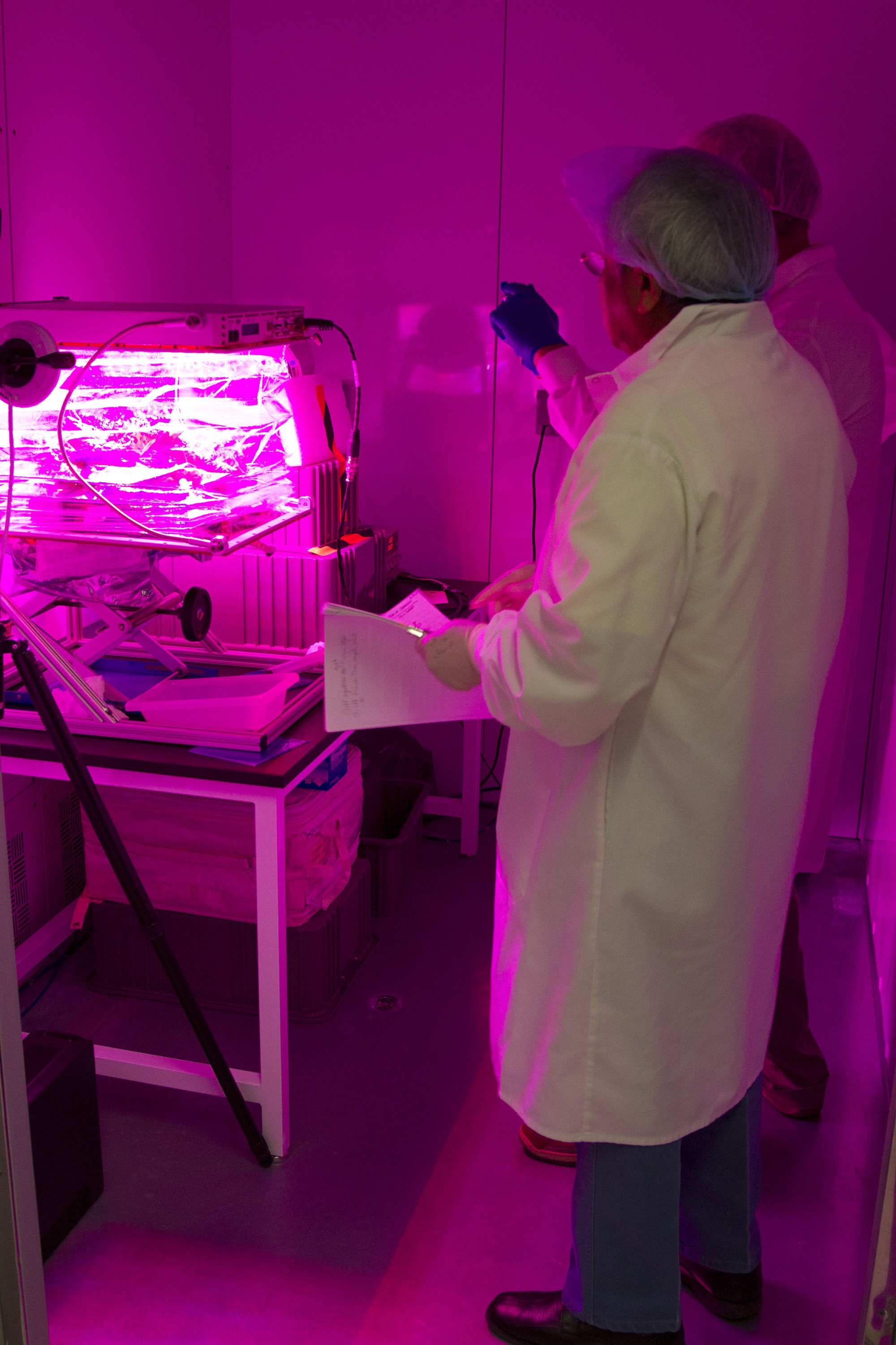 CAPE CANAVERAL, Fla. – Researchers review procedures for harvesting the outredgeous red lettuce leaves in the Veggie plant growth system inside the International Space Station Environmental Simulator chamber at the Space Station Processing Facility at NASA's Kennedy Space Center in Florida. The growth chamber was used as a control unit and procedures were followed identical to those being performed on Veggie and the Veg-01 experiment on the International Space Station. The chamber mimicked the temperature, relative humidity and carbon dioxide concentration of those in the Veggie unit on the space station. Veggie and Veg-01 were delivered to the space station aboard the SpaceX-3 mission. Veggie is the first fresh food production system delivered to the station. Six plant pillows, each containing outredgeous red romaine lettuce seeds and a root mat were inserted into Veggie. The plant chamber's red, blue and green LED lights were activated. The plant growth was monitored for 33 days. On June 10, at the end of the cycle, the plants were carefully harvested, frozen and stored for return to Earth by Expedition 39 flight engineer and NASA astronaut Steve Swanson. Photo credit: NASA/Frankie Martin