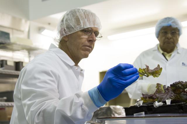 CAPE CANAVERAL, Fla. – Jim Smodell, a technician with SGT, removes an outredgeous red lettuce leaf from a plant pillow inside the Payload Development Laboratory at the Space Station Processing Facility, or SSPF, at NASA's Kennedy Space Center in Florida. In the background is George Guerra, a quality control engineer with QinetiQ North America. The plant pillows were removed from the Veggie plant growth system inside a control chamber at the SSPF. The growth chamber was used as a control unit for Veggie and procedures were followed identical to those being performed on Veggie and the Veg-01 experiment on the International Space Station. The chamber mimicked the temperature, relative humidity and carbon dioxide concentration of those in the Veggie unit on the space station. Veggie and Veg-01 were delivered to the space station aboard the SpaceX-3 mission. Veggie is the first fresh food production system delivered to the station. Six plant pillows, each containing outredgeous red romaine lettuce seeds and a root mat were inserted into Veggie. The plant chamber's red, blue and green LED lights were activated. The plant growth was monitored for 33 days. On June 10, at the end of the cycle, the plants were carefully harvested, frozen and stored for return to Earth by Expedition 39 flight engineer and NASA astronaut Steve Swanson. Photo credit: NASA/Frankie Martin