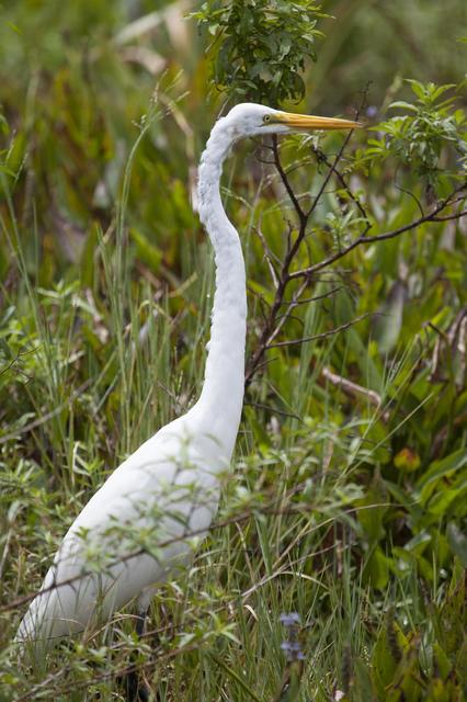 CAPE CANAVERAL, Fla. -- This molting great egret is in its natural habitat in the tall grass on NASA's Kennedy Space Center in Florida. The undeveloped property on Kennedy Space Center is managed by the U.S. Fish and Wildlife Service through the Merritt Island National Wildlife Refuge. The refuge provides a habitat for a plethora of wildlife, including 330 species of birds. For information on the refuge, visit http://www.fws.gov/merrittisland/Index.html. Photo credit: NASA/Daniel Casper