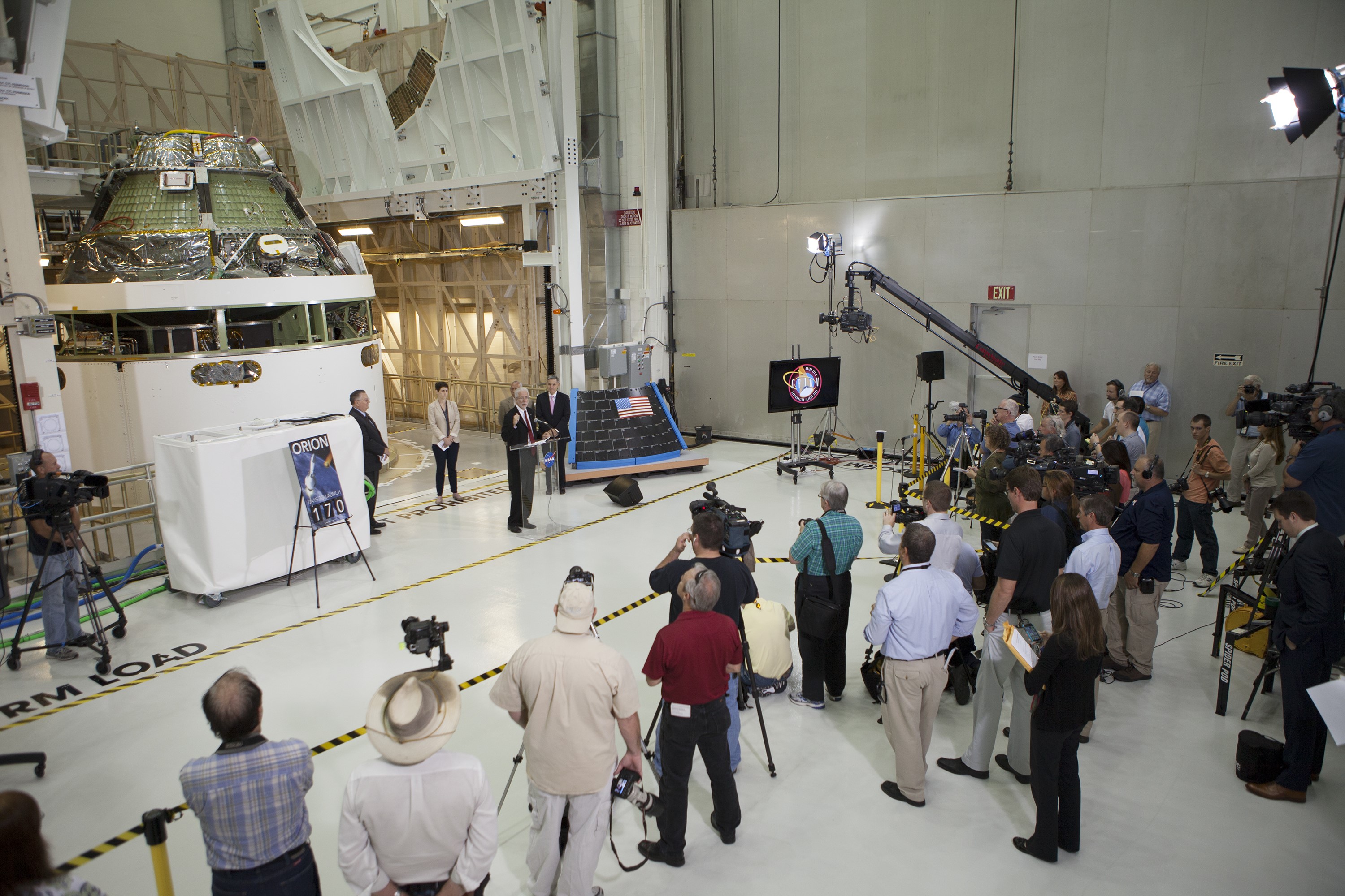 CAPE CANAVERAL, Fla. – Members of the media listen as NASA Orion Program Manager Mark Geyer marks the T-6 months and counting to the launch of Orion on Exploration Flight Test-1, or EFT-1, in the Operations and Checkout Building high bay at NASA's Kennedy Space Center in Florida. To his right is Kennedy Director Bob Cabana. Partially hidden behind him is NASA Administrator Charlie Bolden. To his left is Cleon Lacefield, Lockheed Martin Orion Program manager, and Rachel Kraft, NASA Public Affairs Officer. Behind them is the crew module stacked on the service module in the Final Assembly and System Testing cell. EFT-1 will provide engineers with data about the heat shield's ability to protect Orion and its future crews from the 4,000-degree heat of reentry and an ocean splashdown following the spacecraft’s 20,000-mph reentry from space. Data gathered during the flight will inform decisions about design improvements on the heat shield and other Orion systems, and authenticate existing computer models and new approaches to space systems design and development. This process is critical to reducing overall risks and costs of future Orion missions. Orion is the exploration spacecraft designed to carry astronauts to destinations not yet explored by humans, including an asteroid and Mars. It will have emergency abort capability, sustain the crew during space travel and provide safe re-entry from deep space return velocities. The first unpiloted test flight of the Orion is scheduled to launch later this year atop a Delta IV rocket from Cape Canaveral Air Force Station in Florida to an altitude of 3,600 miles above the Earth's surface. The two-orbit, four-hour flight test will help engineers evaluate the systems critical to crew safety including the heat shield, parachute system and launch abort system. For more information, visit http://www.nasa.gov/orion. Photo credit: NASA/Kim Shiflett