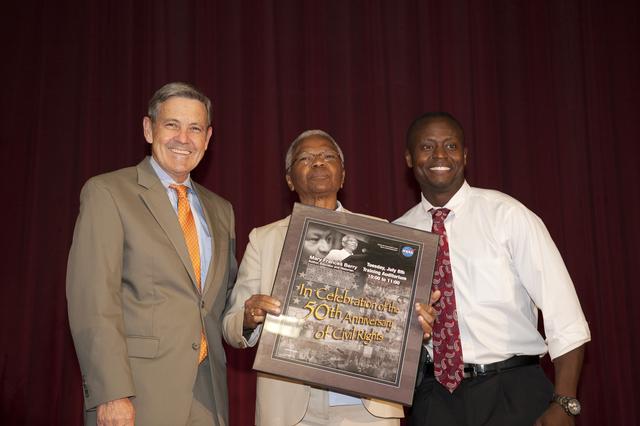 CAPE CANAVERAL, Fla. -- In the KSC Training Auditorium at NASA's Kennedy Space Center in Florida, Dr. Mary Frances Berry, center, accepts a framed poster announcing her appearance from Center Director Robert Cabana, left, who made the opening remarks, and Yves Lamothe, right, transition manager for the Ground Systems Development and Operations Program, the master of ceremonies. Berry served as the assistant secretary for education in the U.S. Department of Health, Education and Welfare HEW between 1977 and 1980. From 1980 to 2004, she was a member of the U.S. Commission on Civil Rights, serving as chair from 1993 to 2004. Among Berry's many honors are the NAACP's Roy Wilkins Award, the Rosa Parks Award of the Southern Christian Leadership Conference, and the Ebony Magazine Black Achievement Award. She is one of 75 women featured in the book "I Dream a World: Portraits of Black Women Who Changed America." Sienna College Research Institute and the Women's Hall of Fame also designated her one of "America's Women of the Century." The event was presented by Kennedy's Office of Diversity and Equal Opportunity. For more information about Kennedy Space Center, visit http://www.nasa.gov/kennedy. Photo credit: NASA/Kim Shiflett