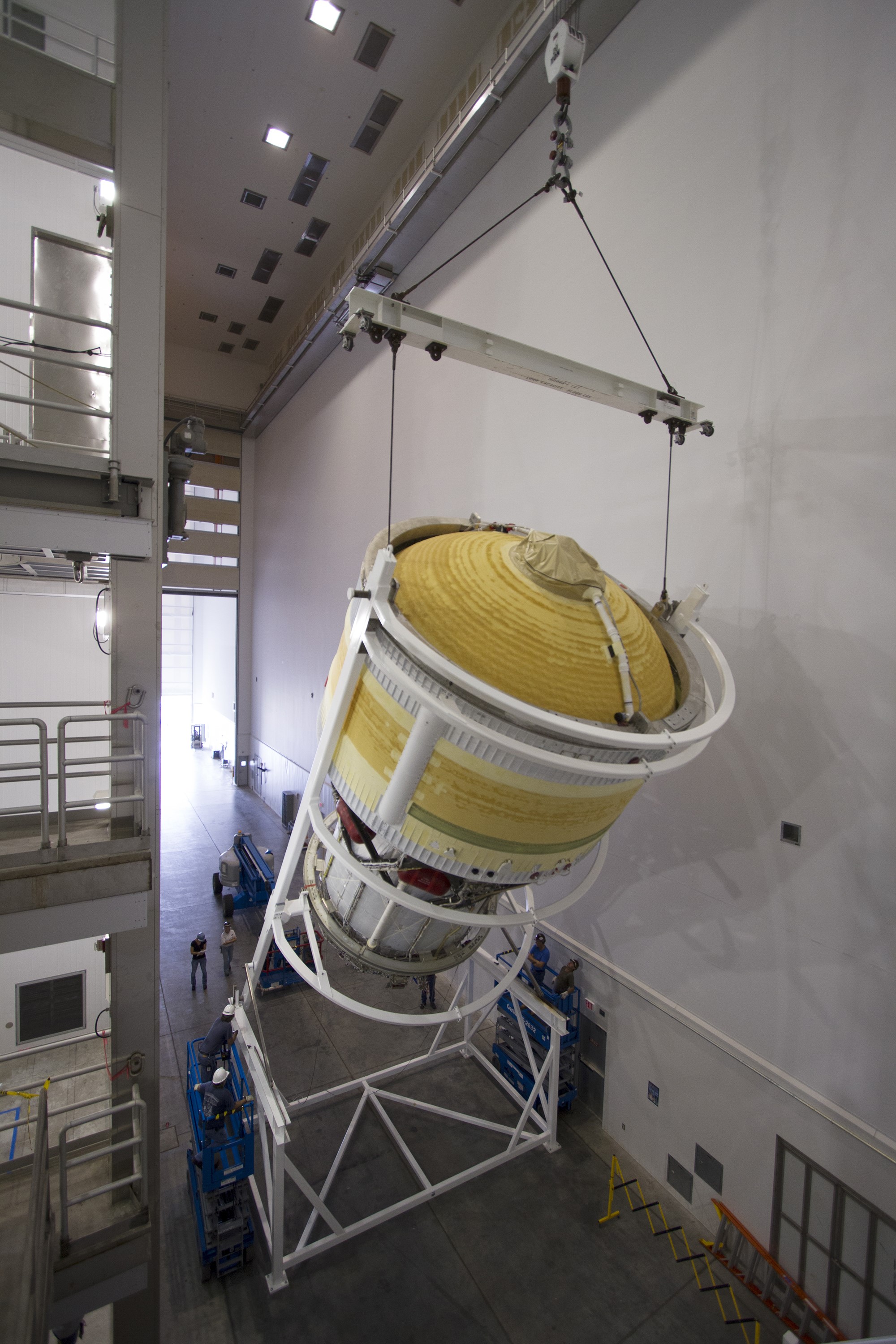 CAPE CANAVERAL, Fla. – Inside the Delta Operations Center near Space Launch Complex 37 on Cape Canaveral Air Force Station in Florida, the second stage for the United Launch Alliance Delta IV Heavy for Exploration Flight Test-1, or EFT-1, is being lifted by crane in its cradle for the move to a test cell. At the Horizontal Integration Facility, all three booster stages will be processed and checked out before being moved to the nearby launch pad and hoisted into position. During the EFT-1 mission, Orion will travel farther into space than any human spacecraft has gone in more than 40 years. The data gathered during the flight will influence design decisions, validate existing computer models and innovative new approaches to space systems development, as well as reduce overall mission risks and costs for later Orion flights. Liftoff of Orion on EFT-1 is planned for fall 2014. Photo credit: NASA/Frankie Martin