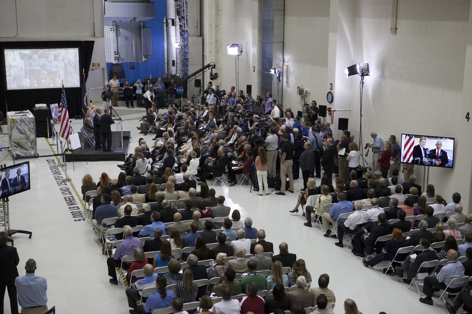 CAPE CANAVERAL, Fla. -- At the Kennedy Space Center in Florida, a crowd turns out for a ceremony renaming the refurbished Operations and Checkout Building for Apollo 11 astronaut Neil Armstrong, the first person to set foot on the moon. The building's high bay is being used to support the agency's new Orion spacecraft and is the same spaceport facility where the Apollo 11 command/service module and lunar module were prepped for the first lunar landing mission in 1969. Orion is designed to take humans farther than they’ve ever gone before, serving as the exploration vehicle that will carry astronauts to deep space and sustain the crew during travel to destinations such as an asteroid or Mars. The ceremony was part of NASA's 45th anniversary celebration of the Apollo 11 moon landing. As the world watched, Neil Armstrong and Buzz Aldrin landed in the moon's Sea of Tranquility on July 20, 1969, aboard the lunar module Eagle. Meanwhile, crewmate Michael Collins orbited above in the command module Columbia. For more, visit http://www.nasa.gov/press/2014/july/nasa-honors-historic-first-moon-landing-eyes-first-mars-mission. Photo credit: NASA/Kim Shiflett