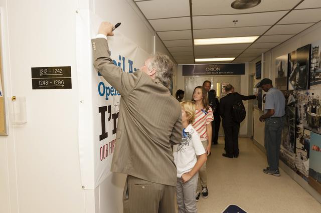 CAPE CANAVERAL, Fla. -- Family members of Apollo 11 astronaut Neil Armstrong sign a banner displaying the new name of the Operations and Checkout Building at NASA's Kennedy Space Center in Florida. The banner signing followed a ceremony renaming the refurbished building for Apollo 11 astronaut Neil Armstrong, the first person to set foot on the moon. From left are Armstrong's son Rick, his grandson Bryce and his granddaughter Lily. The building's high bay is being used to support the agency's new Orion spacecraft and is the same spaceport facility where the Apollo 11 command/service module and lunar module were prepped for the first lunar landing mission in 1969. Orion is designed to take humans farther than they’ve ever gone before, serving as the exploration vehicle that will carry astronauts to deep space and sustain the crew during travel to destinations such as an asteroid or Mars. The ceremony was part of NASA's 45th anniversary celebration of the Apollo 11 moon landing. As the world watched, Neil Armstrong and Buzz Aldrin landed in the moon's Sea of Tranquility on July 20, 1969, aboard the lunar module Eagle. Meanwhile, crewmate Michael Collins orbited above in the command module Columbia. For more, visit http://www.nasa.gov/press/2014/july/nasa-honors-historic-first-moon-landing-eyes-first-mars-mission. Photo credit: NASA/Kevin O'Connell