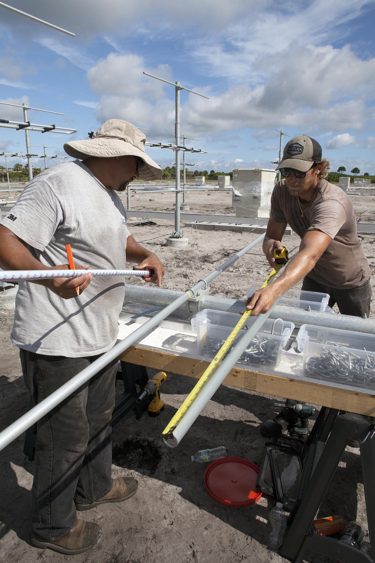 CAPE CANAVERAL, Fla. – Felix Gamez and Jacob Walls, right, of Qinetiq North America take measurements as they prepare to install an antenna in the antenna field for NASA Kennedy Space Center’s Doppler radar wind profiler. Located near the spaceport’s Shuttle Landing Facility runway, the profiler is being upgraded to a new, state-of-the-art version that will help forecasters and launch teams characterize upper-level winds in the area. This profiler will help in the detection of wind-shear conditions during launch. Photo credit: NASA/Ben Smegelsky