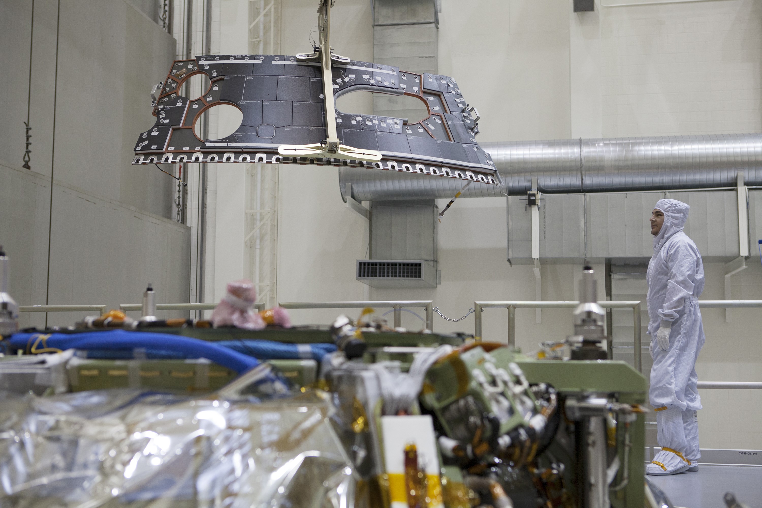 CAPE CANAVERAL, Fla. – Inside the Operations and Checkout Building high bay at NASA's Kennedy Space Center in Florida, a technician dressed in a clean-room suit monitors the progress as a crane is used to lower a back shell tile panel for installation on the Orion crew module. Preparations are underway for Exploration Flight Test-1, or EFT-1. Orion is the exploration spacecraft designed to carry astronauts to destinations not yet explored by humans, including an asteroid and Mars. It will have emergency abort capability, sustain the crew during space travel and provide safe re-entry from deep space return velocities. The first unpiloted test flight of the Orion is scheduled to launch later this year atop a Delta IV rocket from Cape Canaveral Air Force Station in Florida to an altitude of 3,600 miles above the Earth's surface. The two-orbit, four-hour flight test will help engineers evaluate the systems critical to crew safety including the heat shield, parachute system and launch abort system. For more information, visit http://www.nasa.gov/orion. Photo credit: NASA/Dimitri Gerondidakis
