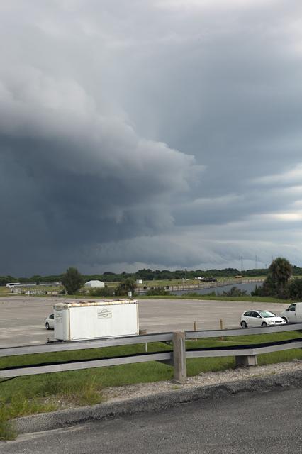 CAPE CANAVERAL, Fla. – This view from the NASA Press Site parking lot captures storm clouds approaching Launch Pad 39B, in the distance at right, at NASA’s Kennedy Space Center in Florida. Kennedy's Ground Support Development and Operations Program is hard at work transforming the center's facilities into a multi-user spaceport, when the weather permits. For more on Kennedy Space Center, visit http://www.nasa.gov/kennedy. Photo credit: NASA/Ben Smegelsky