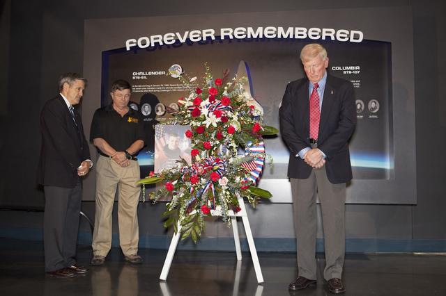 CAPE CANAVERAL, Fla. -- From left, Kennedy Space Center Director Bob Cabana, Kenneth Cameron, and Jon McBride, all former NASA astronauts, pause for reflection after placing a wreath honoring former NASA astronaut Steven R. Nagel at the Space Shuttle Atlantis exhibit at the Kennedy Space Center Visitor Complex in Florida. Nagel died Aug. 21 after a long illness. He was 67 years old. Nagel served as a mission specialist on his first space shuttle flight, STS-51G, in 1985. He was pilot on his second shuttle flight, STS-61A, also in 1985. He commanded his final two flights, STS-37 and STS-55, in 1991 and 1993, respectively. He logged a total of 723 hours in space. To learn more about Nagel's career, visit http://www.nasa.gov/press/2014/august/former-nasa-astronaut-steven-nagel-veteran-of-four-shuttle-flights-dies-at-67/. Photo credit: NASA/Dimitri Gerondidakis