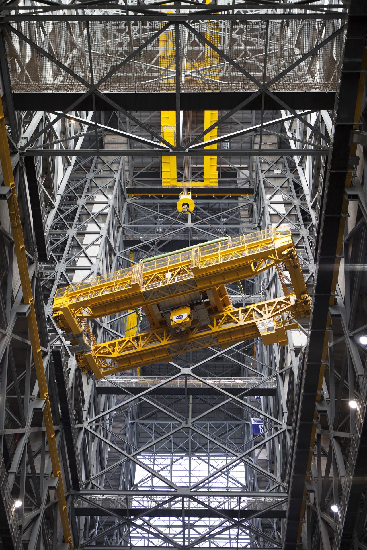 CAPE CANAVERAL, Fla. – Inside the Vehicle Assembly Building, or VAB, at NASA's Kennedy Space Center in Florida, the 175-ton crane is being turned as it is lowered by crane from Level 16 down to the transfer aisle floor. Upgrades to the crane's 45-year-old controls will be performed in order to improve reliability, precision and safety. The Ground Systems Development and Operations Program is overseeing upgrades and modifications to the VAB. The crane will be upgraded so that it can support lifting needs for NASA and other exploration vehicles, including the agency's Space Launch System and Orion spacecraft. Photo credit: NASA/Daniel Casper