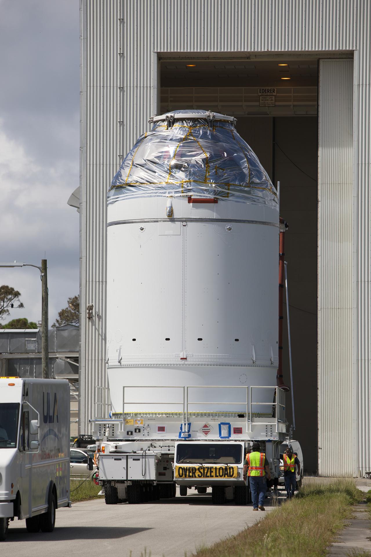 CAPE CANAVERAL, Fla. – The Orion crew module, stacked atop its service module, begins its move from the Payload Hazardous Servicing Facility, or PHSF, to the Launch Abort System Facility, or LASF, at NASA's Kennedy Space Center in Florida. The spacecraft for Exploration Flight Test-1 was fueled in the PHSF. Inside the LASF, the Launch Abort System will be installed around the Orion spacecraft ahead of its December flight test. Orion is the exploration spacecraft designed to carry astronauts to destinations not yet explored by humans, including an asteroid and Mars. It will have emergency abort capability, sustain the crew during space travel and provide safe re-entry from deep space return velocities. The first unpiloted test flight of the Orion is scheduled to launch atop a United Launch Alliance Delta IV Heavy rocket from Cape Canaveral Air Force Station in Florida to an altitude of 3,600 miles above the Earth's surface. The two-orbit, four-hour flight test will help engineers evaluate the systems critical to crew safety including the heat shield, parachute system and launch abort system. For more information, visit http://www.nasa.gov/orion. Photo credit: NASA/Dimitri Gerondidakis