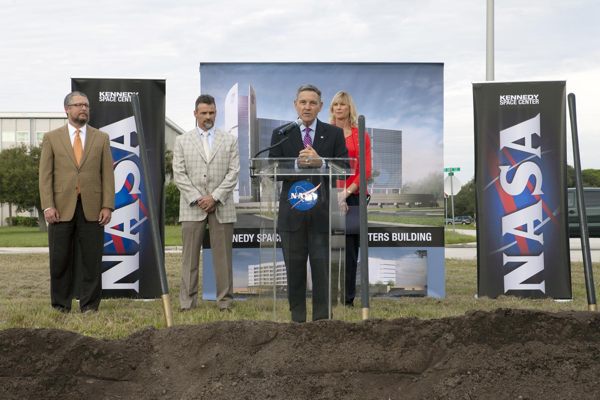 CAPE CANAVERAL, Fla. – Groundbreaking for the new Central Campus took place in the Industrial Area at NASA's Kennedy Space Center in Florida. Kennedy Center Director Bob Cabana speaks to members of the media and guests during the ceremony. Behind Cabana is Nancy Bray, director of Kennedy's Center Operations Directorate. From far left, are Steve Belflower, vice president of HuntonBrady Architects of Orlando, and Kirk Hazen, southeast district manager and vice president of Hensel Phelps, the construction contractor. Kennedy is transforming into a multi-user, 21st century spaceport supporting both commercial and government users and operations. Central Campus Phase I includes construction of a new Headquarters Building as one of the major components of the strategy. The new Headquarters Building will be a seven-story, 200,000-square-foot facility that will house about 500 NASA civil service and contractor employees. Photo credit: NASA/Kim Shiflett