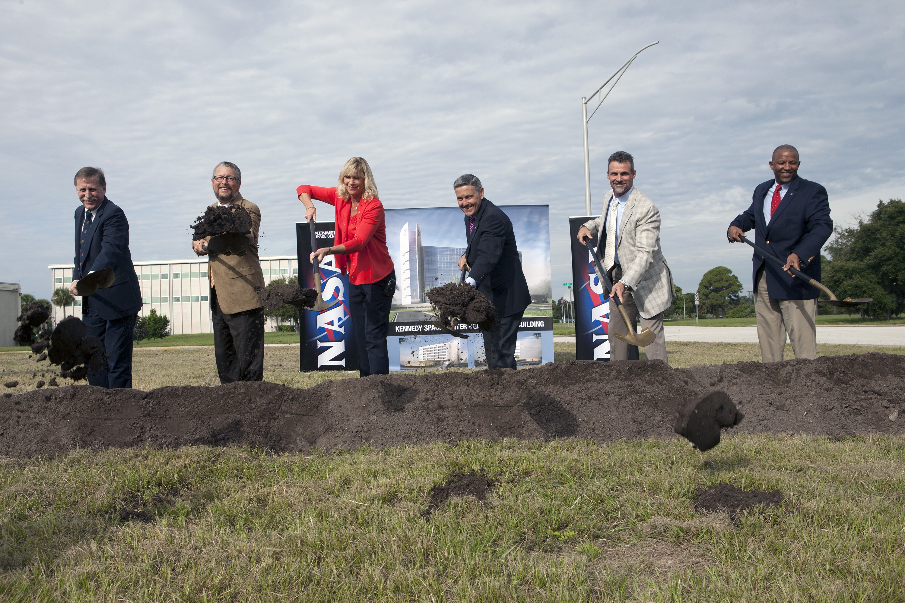 CAPE CANAVERAL, Fla. – Groundbreaking for the new Central Campus took place in the Industrial Area at NASA's Kennedy Space Center in Florida. Digging in with shovels during the groundbreaking ceremony, are Dan Tweed, associate director for Facilities at Kennedy Steve Belflower, vice president of HuntonBrady Architects of Orlando Nancy Bray, director of Kennedy's Center Operations Directorate Kennedy Center Director Bob Cabana Kirk Hazen, southeast district manager and vice president of Hensel Phelps, the construction contractor and Kelvin Manning, Kennedy's associate director. Kennedy is transforming into a multi-user, 21st century spaceport supporting both commercial and government users and operations. Central Campus Phase I includes construction of a new Headquarters Building as one of the major components of the strategy. The new Headquarters Building will be a seven-story, 200,000-square-foot facility that will house about 500 NASA civil service and contractor employees. Photo credit: NASA/Kim Shiflett