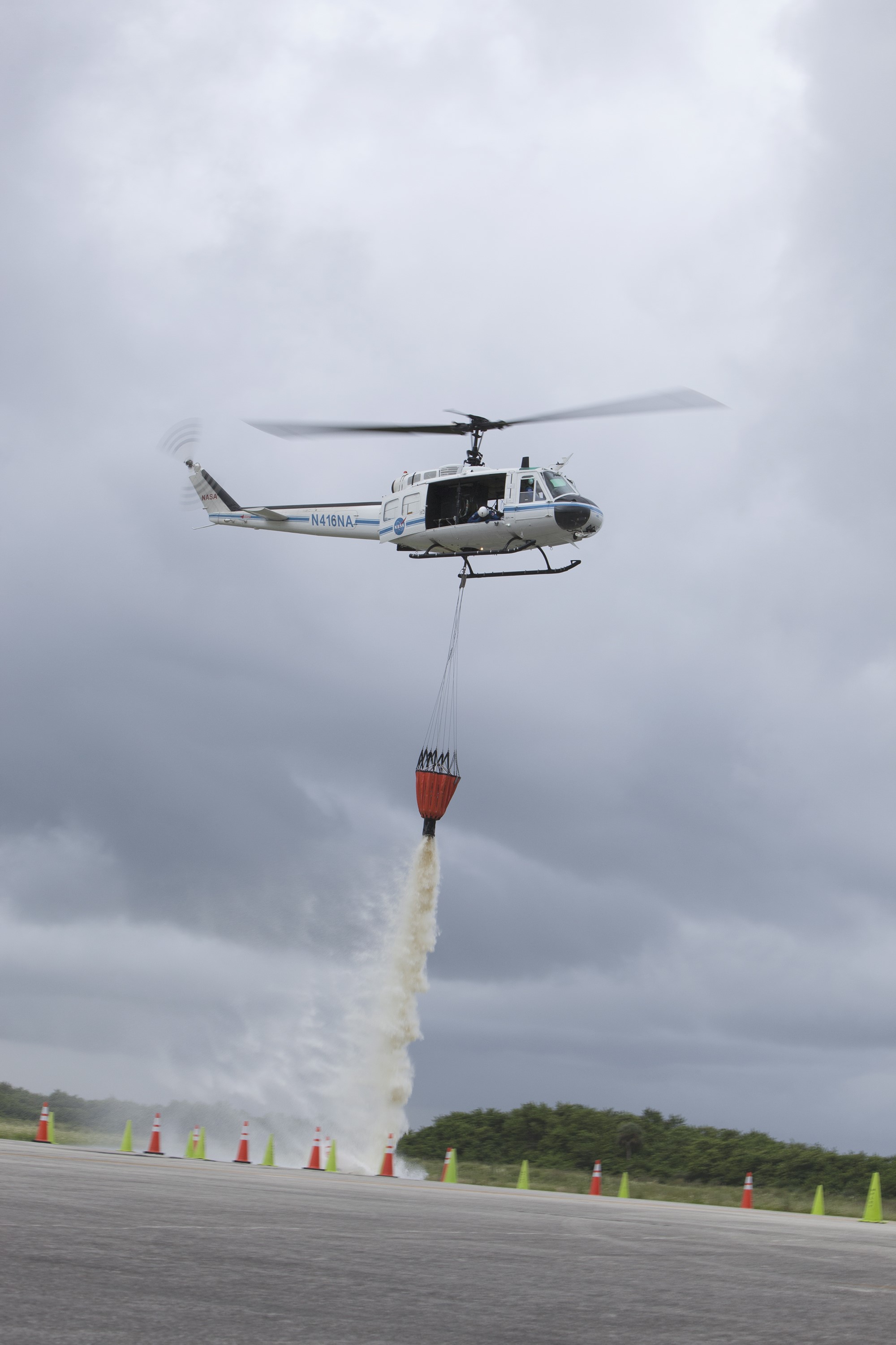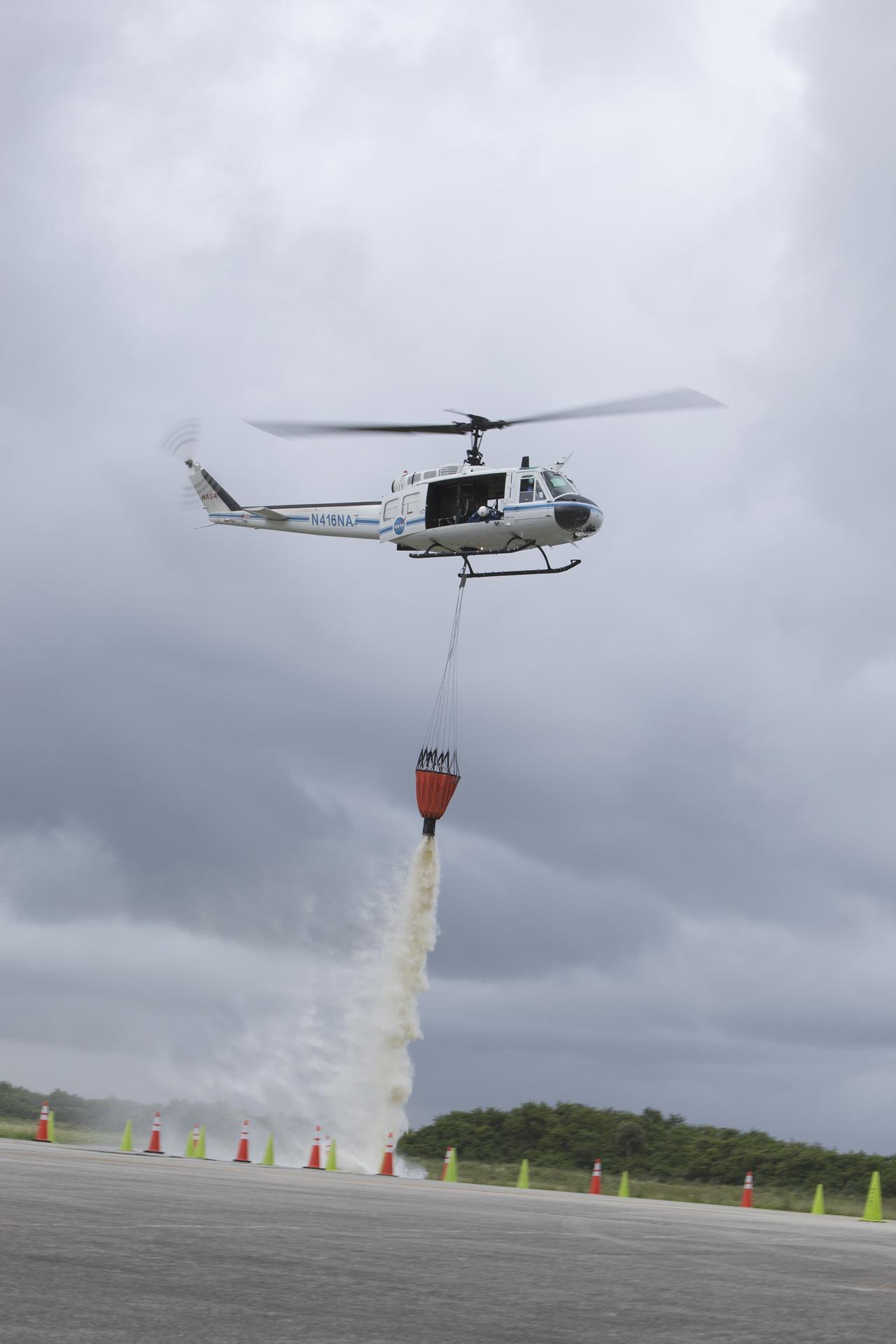CAPE CANAVERAL, Fla. -- At NASA's Kennedy Space Center in Florida, a three-person helicopter crew recently practiced using a Bambi Bucket to pick up water from a nearby waterway and dropping it on simulated targets at the center’s Shuttle Landing Facility. Firefighters respond to wildfires with teams on the ground and in the air. The most up-to-date tools include helicopters that use Bambi Buckets large quantities of water. NASA Flight Operations teams are training to perfect the skills needed to ensure they are ready to use tools, such as the Bambi Bucket, in the event of an out-of-control blaze at the spaceport. Photo credit: NASA/Frankie Martin