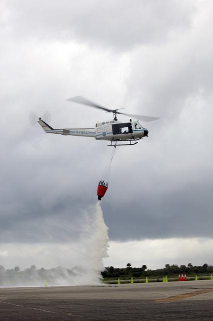 CAPE CANAVERAL, Fla. -- At NASA's Kennedy Space Center in Florida, a three-person helicopter crew recently practiced using a Bambi Bucket to pick up water from a nearby waterway and dropping it on simulated targets at the center’s Shuttle Landing Facility. Firefighters respond to wildfires with teams on the ground and in the air. The most up-to-date tools include helicopters that use Bambi Buckets large quantities of water. NASA Flight Operations teams are training to perfect the skills needed to ensure they are ready to use tools, such as the Bambi Bucket, in the event of an out-of-control blaze at the spaceport. Photo credit: NASA/Frankie Martin
