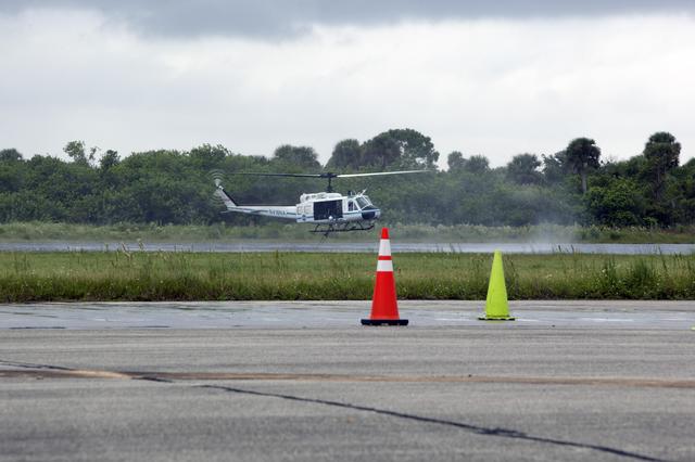 CAPE CANAVERAL, Fla. -- At NASA's Kennedy Space Center in Florida, the crew of the NASA helicopter carefully lowers a Bambi Bucket into a canal near the Shuttle Landing Facility. Minutes later, the water was dropped on the target cones in the foreground, using techniques that would be employed to fight a brush fire at the Kennedy Space Center. Firefighters respond to wildfires with teams on the ground and in the air. The most up-to-date tools include helicopters that use Bambi Buckets large quantities of water. NASA Flight Operations teams are training to perfect the skills needed to ensure they are ready to use tools, such as the Bambi Bucket, in the event of an out-of-control blaze at the spaceport. Photo credit: NASA/Frankie Martin
