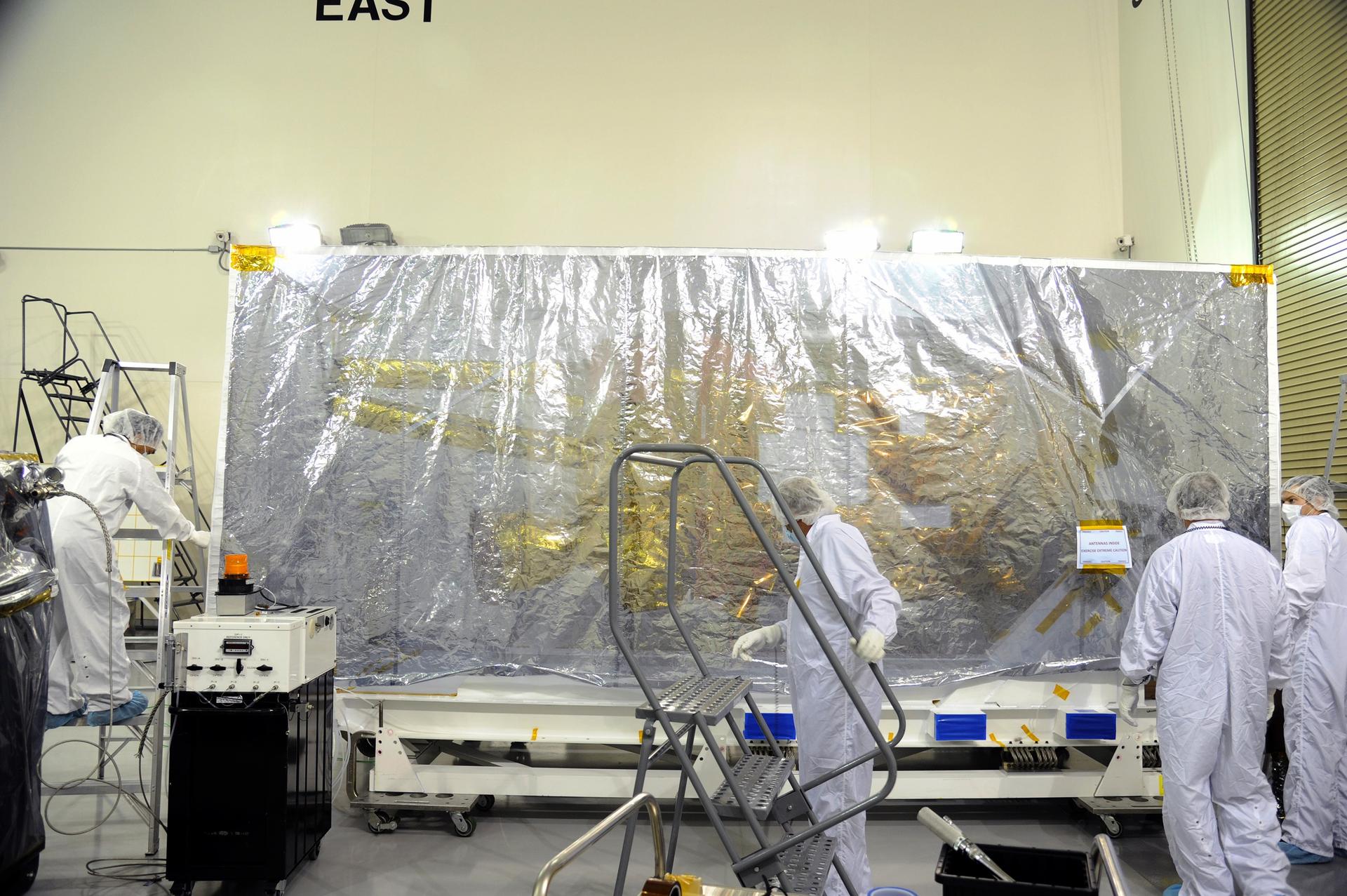 VANDENBERG AIR FORCE BASE, Calif. – The protective covering has been replaced around NASA's Soil Moisture Active Passive, or SMAP, spacecraft following the spacecraft's post-shipment inspection in the Astrotech payload processing facility on Vandenberg Air Force Base in California. The covering will protect the spacecraft from static-charge buildup and contamination while it awaits further processing. SMAP will launch on a Delta II 7320 configuration vehicle featuring a United Launch Alliance first stage booster powered by an Aerojet Rocketdyne RS-27A main engine and three Alliant Techsystems, or ATK, strap-on solid rocket motors. Once on station in Earth orbit, SMAP will provide global measurements of soil moisture and its freeze/thaw state. These measurements will be used to enhance understanding of processes that link the water, energy and carbon cycles, and to extend the capabilities of weather and climate prediction models. SMAP data also will be used to quantify net carbon flux in boreal landscapes and to develop improved flood prediction and drought monitoring capabilities. Launch from Space Launch Complex 2 is targeted for Jan. 29, 2015. To learn more about SMAP, visit http://smap.jpl.nasa.gov. Photo credit: NASA/Robert Rasmison