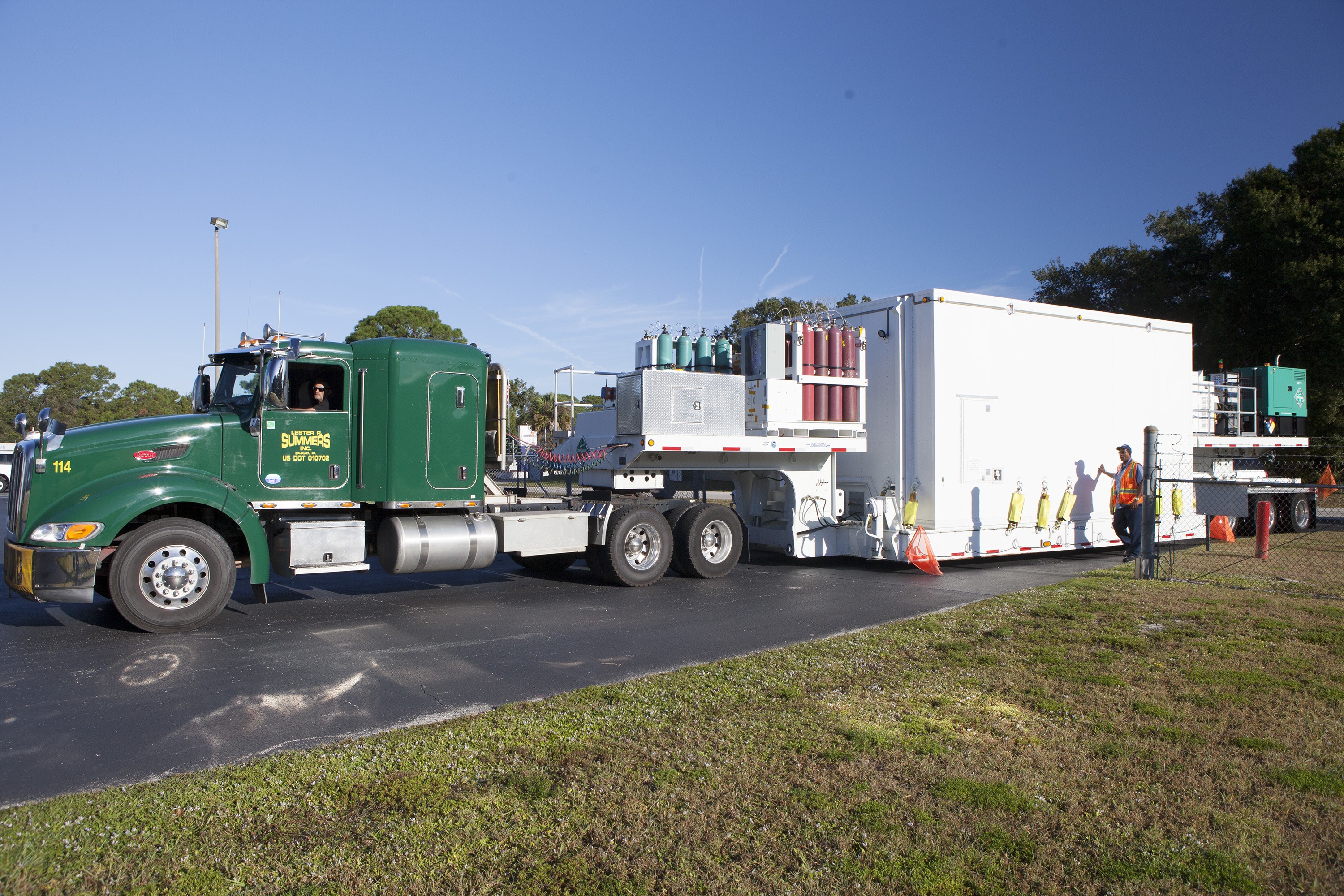 CAPE CANAVERAL, Fla. – The Magnetospheric Multiscale spacecraft, enclosed in a protective shipping container, are delivered by truck to the Astrotech payload processing facility in Titusville, Florida, near Kennedy Space Center. MMS is a Solar Terrestrial Probes mission comprising four identically instrumented spacecraft that will use Earth’s magnetosphere as a laboratory to study the microphysics of three fundamental plasma processes: magnetic reconnection, energetic particle acceleration and turbulence. Launch aboard a United Launch Alliance Atlas V rocket from Space Launch Complex 41 on Cape Canaveral Air Force Station is targeted for March 12, 2015. To learn more about MMS, visit http://mms.gsfc.nasa.gov. Photo credit: NASA/Kim Shiflett
