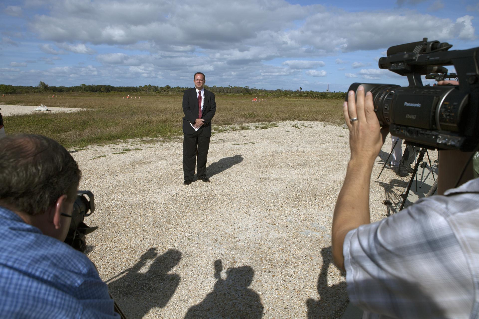 CAPE CANAVERAL, Fla. - Tom Engler, deputy director of Center Planning and Development at NASA's Kennedy Space Center in Florida, speaks to members of the media during an event to announce the agency's Lunar Cargo Transportation and Landing by Soft Touchdown, or Lunar CATALYST, initiative and introduced one of the partners, Moon Express Inc. of Moffett Field, California. The event took place at Kennedy's automated landing and hazard avoidance technology, or ALHAT, hazard field at the north end of the Shuttle Landing Facility. Moon Express is developing a lander with capabilities that will enable delivery of payloads to the surface of the moon, as well as new science and exploration missions of interest to NASA and scientific and academic communities. Moon Express will base its activities at Kennedy and utilize the Morpheus ALHAT field and a hangar nearby for CATALYST testing. The Advanced Exploration Systems Division of NASA's Human Exploration and Operations Mission Directorate manages Lunar CATALYST. Photo credit: NASA/Ben Smegelsky
