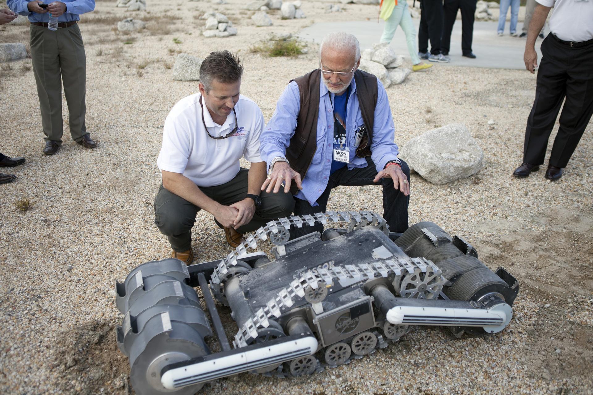 CAPE CANAVERAL, Fla. - Rob Mueller, left, NASA senior technologist in the Surface Systems Office in Kennedy Space Center's Engineering and Technology Directorate, talks with former NASA Apollo astronaut Buzz Aldrin during a demonstration of the Regolith Advanced Surface Systems Operations Robot, or RASSOR, at the automated landing and hazard avoidance technology, or ALHAT, hazard field at the north end of the Shuttle Landing Facility at NASA's Kennedy Space Center in Florida. The event was held to announce Moon Express Inc., of Moffett Field, California is selected to utilize Kennedy facilities for NASA's Lunar Cargo Transportation and Landing by Soft Touchdown, or Lunar CATALYST, initiative. Moon Express is developing a lander with capabilities that will enable delivery of payloads to the surface of the moon, as well as new science and exploration missions of interest to NASA and scientific and academic communities. Moon Express will base its activities at Kennedy and utilize the Morpheus ALHAT field and a hangar nearby for CATALYST testing. The Advanced Exploration Systems Division of NASA's Human Exploration and Operations Mission Directorate manages Lunar CATALYST. Photo credit: NASA/Ben Smegelsky
