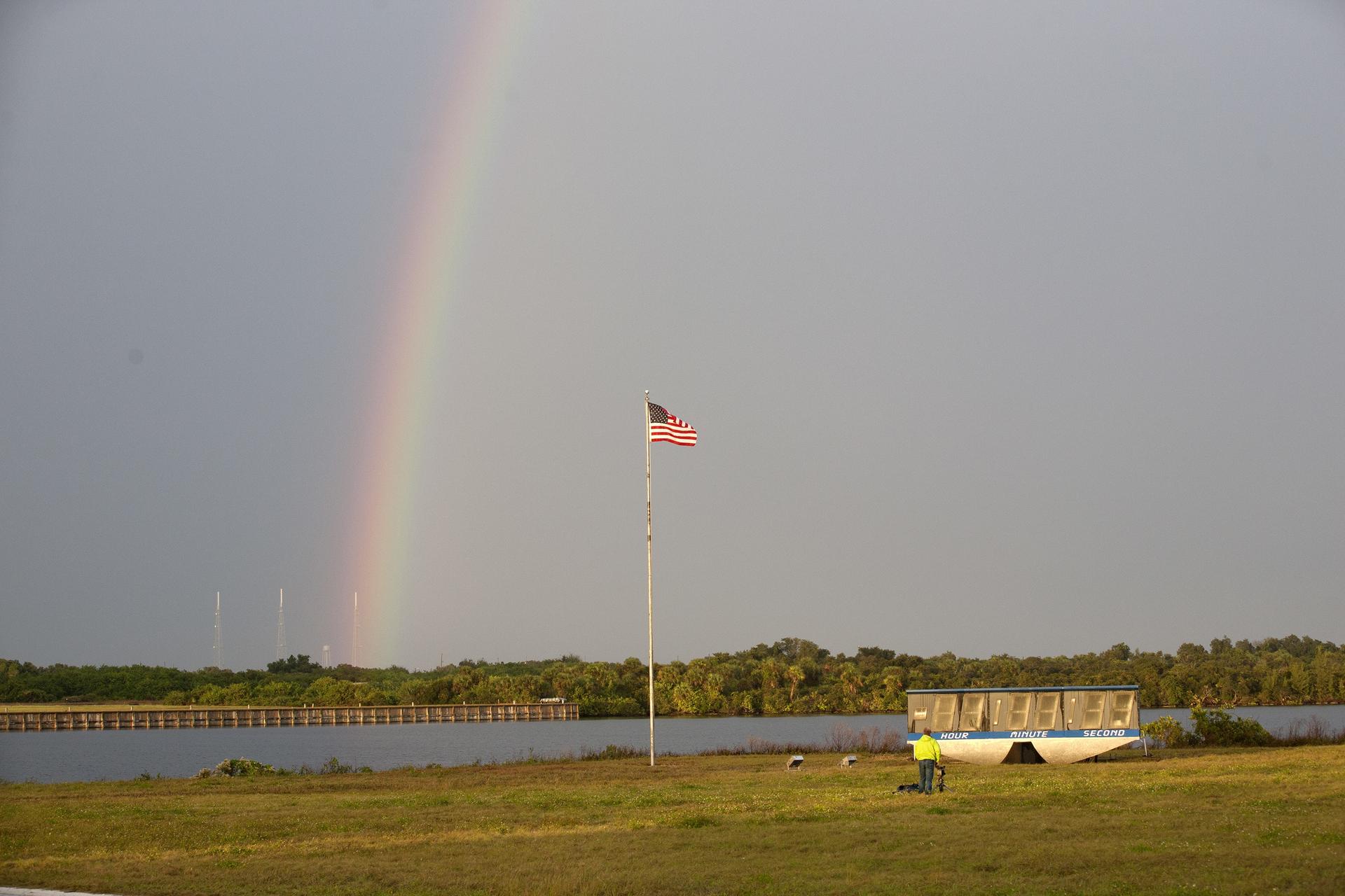 CAPE CANAVERAL, Fla. – As rain showers dissipate, a rainbow appeared over the Kennedy Space Center's Press Site and turn basin. In the foreground is the historic countdown clock. In the background, is Launch Pad 39B where agency's Space Launch System will launch astronauts aboard the Orion spacecraft to deep-space destinations such as an asteroid and Mars. For more information, visit http://www.nasa.gov/kennedy Photo credit: NASA/Kim Shiflett