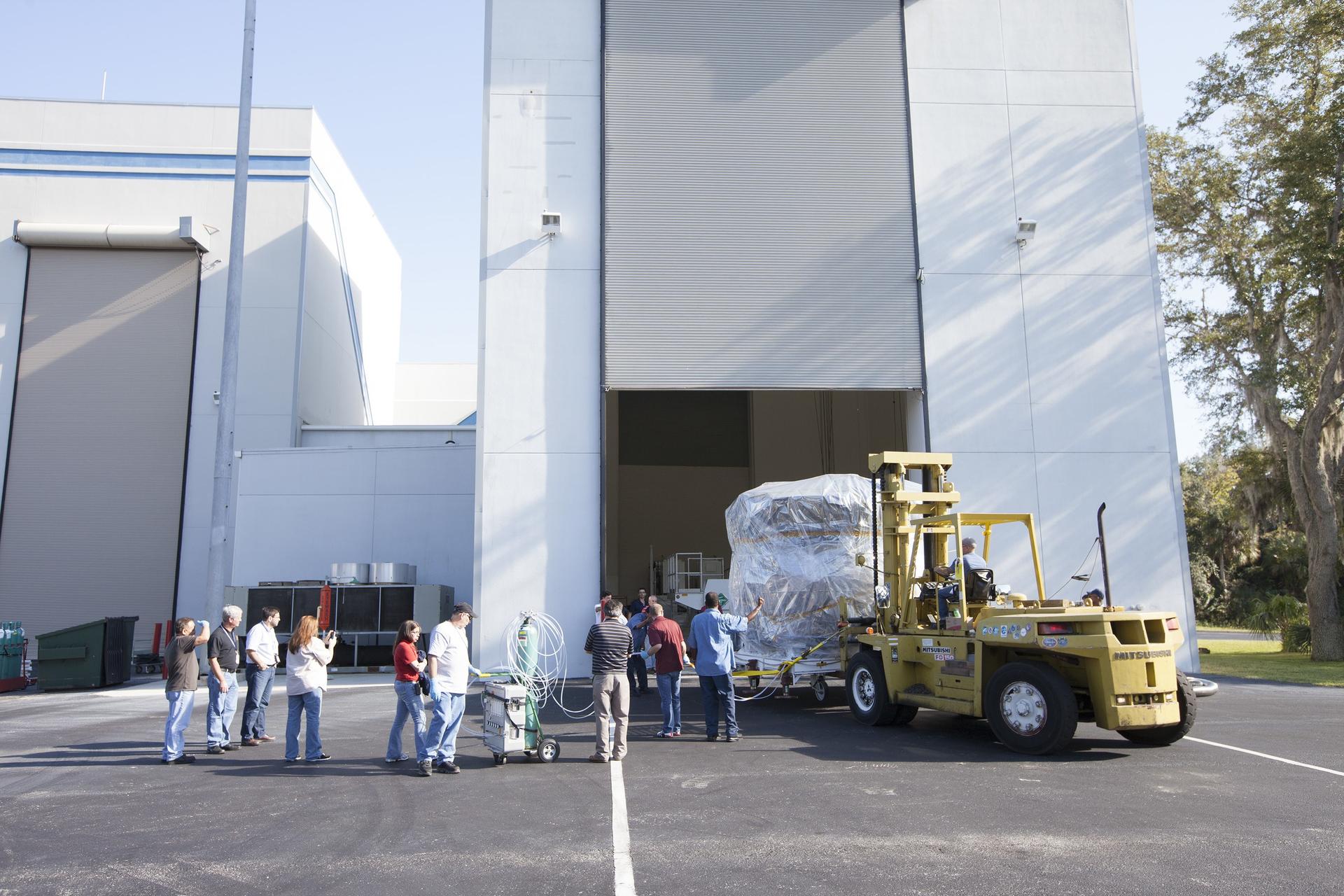 CAPE CANAVERAL, Fla. – Two Magnetospheric Multiscale, or MMS, spacecraft comprising the mission’s upper stack are towed from Building 2 to the Building 1 high bay of the Astrotech payload processing facility in Titusville, Florida, near Kennedy Space Center. The two MMS spacecraft comprising the lower stack arrived at Astrotech on Oct. 29. The Magnetospheric Multiscale mission is a Solar Terrestrial Probes mission comprising four identically instrumented spacecraft that will use Earth’s magnetosphere as a laboratory to study the microphysics of three fundamental plasma processes: magnetic reconnection, energetic particle acceleration and turbulence. Launch aboard a United Launch Alliance Atlas V rocket from Space Launch Complex 41 on Cape Canaveral Air Force Station is targeted for March 12, 2015. To learn more about MMS, visit http://mms.gsfc.nasa.gov. Photo credit: NASA/Kim Shiflett